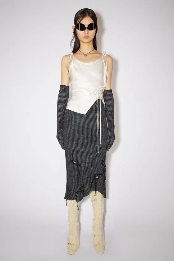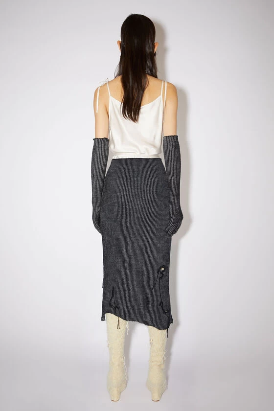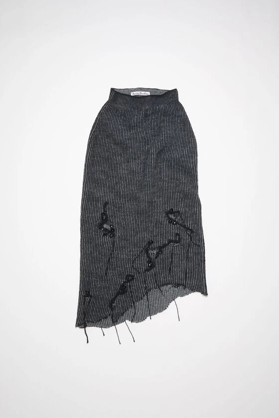Acne Studios anthracite grey skirt features distressed and deconstructed details with an asymmetric hem. Adorned with iridescent embellishments, crafted from a chunky wool cotton blend, and cut to a fitted silhouette.