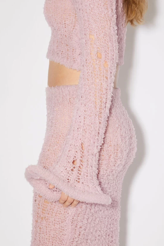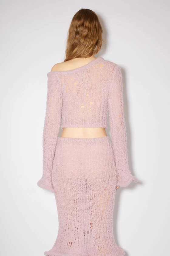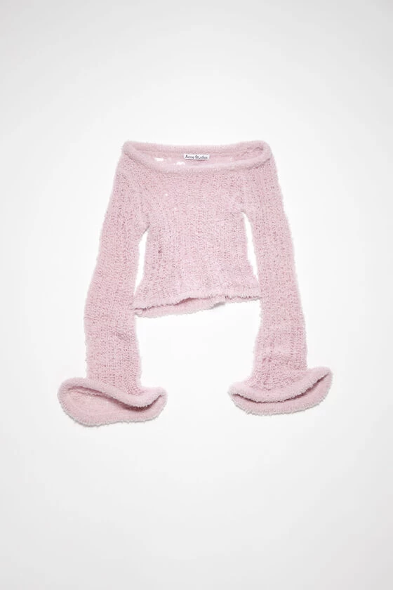 Acne Studios dusty pink jumper is crafted from a lightweight wool blend with a hairy finish and adorned with a malleable wired wavy neckline, hem and cuffs. Cut to a fitted silhouette with an asymmetric neckline, elongated sleeves and above the waist length.
