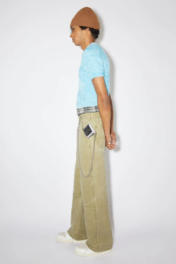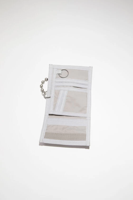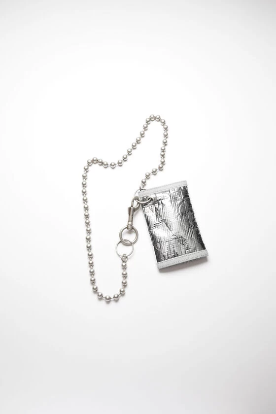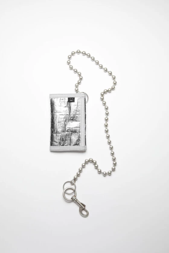 Acne Studios silver wallet features a removable ball chain with a clip and inner pockets. Detailed with a face logo label on the front and Acne Studios logo on the inside.