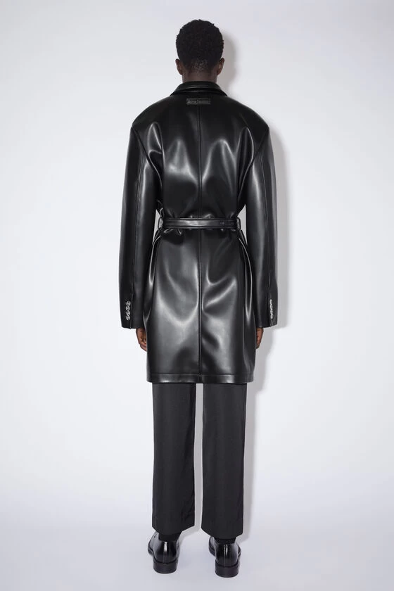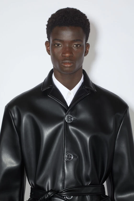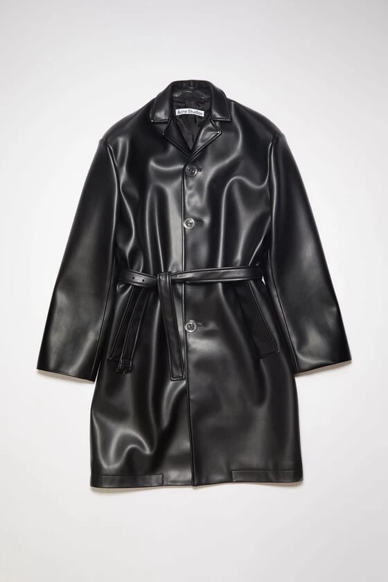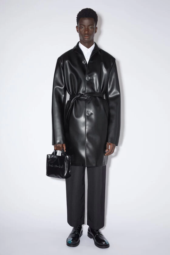 Acne Studios black single-breasted coat features a matt coating finish, detailed with transparent button-up closure and belt with tonal metal eyelets and buckle. Complete with welt pockets and cut to a regular fit.