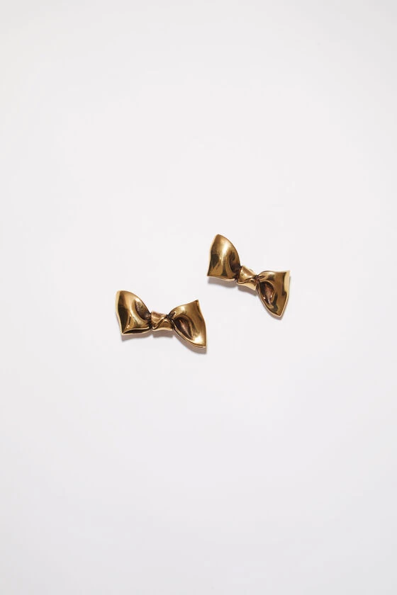 Acne Studios antique gold earrings feature a sculptural bow shape in collaboration with artist Karen Kilimnik, detailed with an engraved logo.
