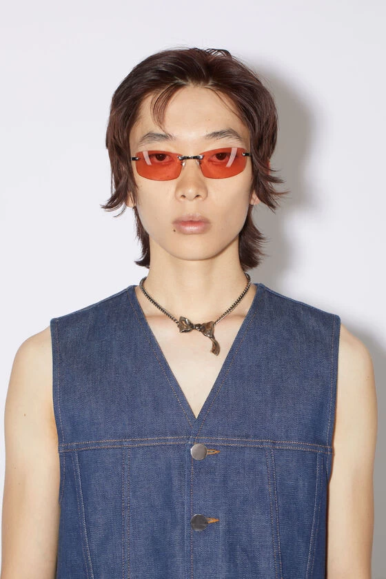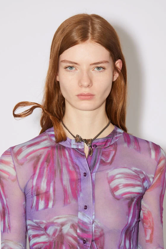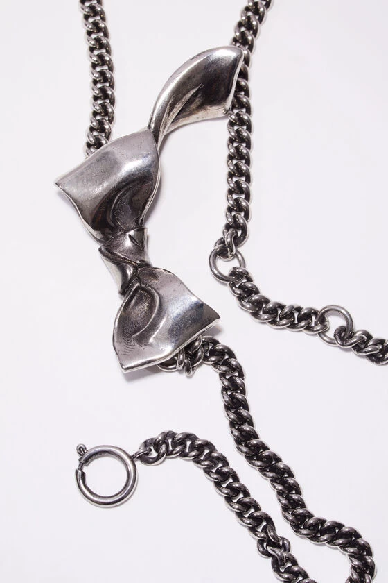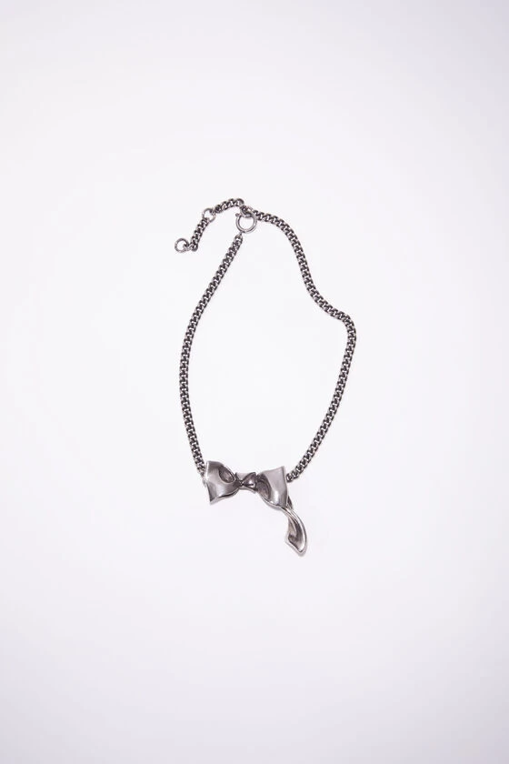 Acne Studios antique silver necklace features a sculptural bow-shaped charm in collaboration with artist Karen Kilimnik, detailed with an engraved logo.