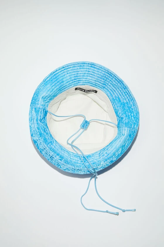 Acne Studios aqua blue bucket hat is crafted from a silk blend with a crushed velvet appearance, constructed entirely from excess fabrics and materials. Detailed with drawstrings with loop adjusters.