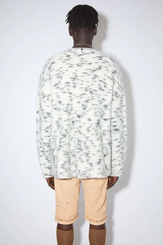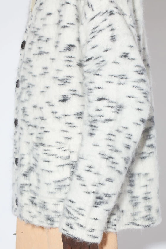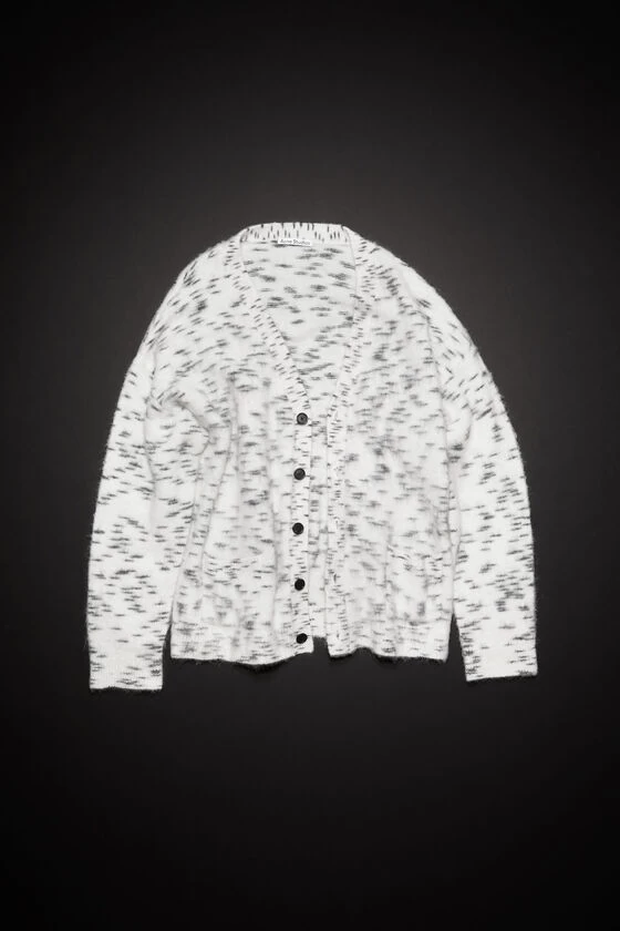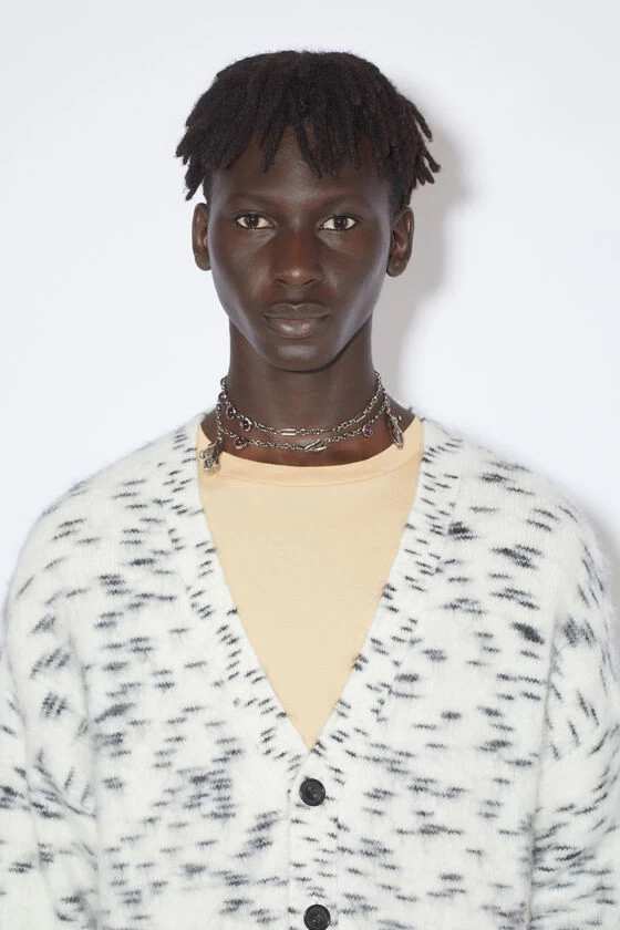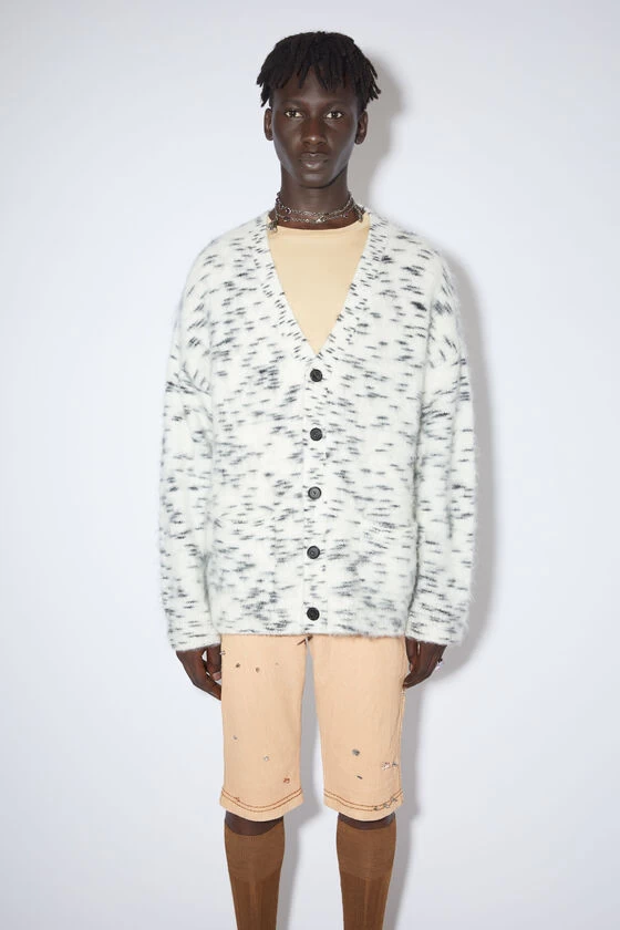 Acne Studios off white cardigan is crafted from a wool mohair blend with a brushed hairy finish, adorned with an irregular spotted pattern. Detailed with a ribbed v-neckline, cuffs and hem. Complete with front pockets and cut to a relaxed fit.