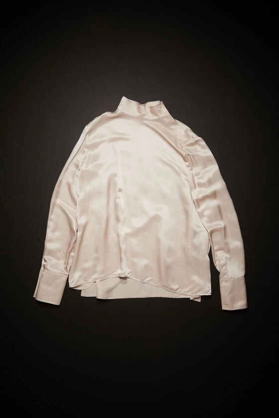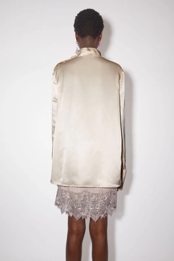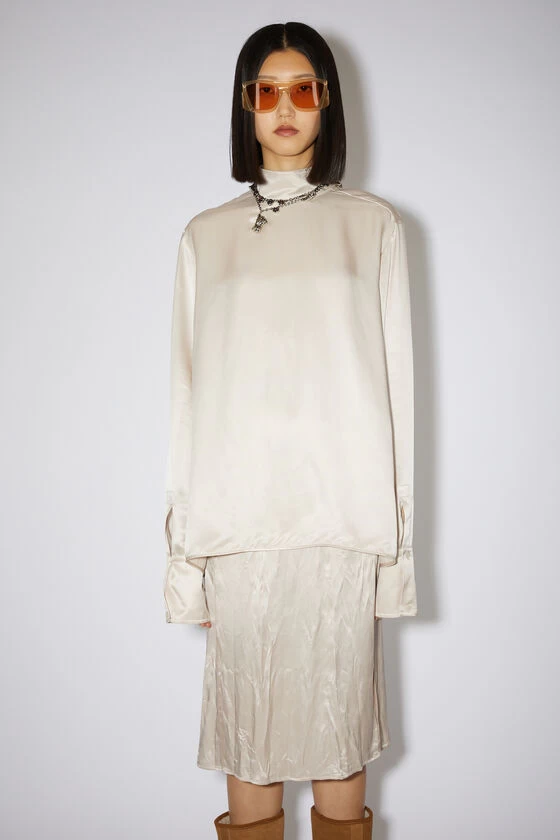Acne Studios pebble beige shirt is crafted from silk-blend satin, detailed with a stand collar and button-up closure at the shoulder and neck. Cut to a relaxed fit and hip length.