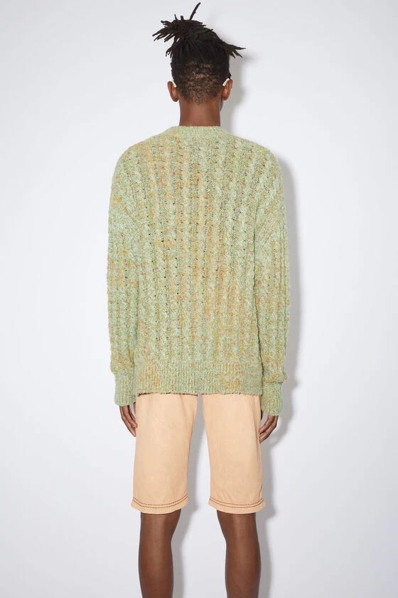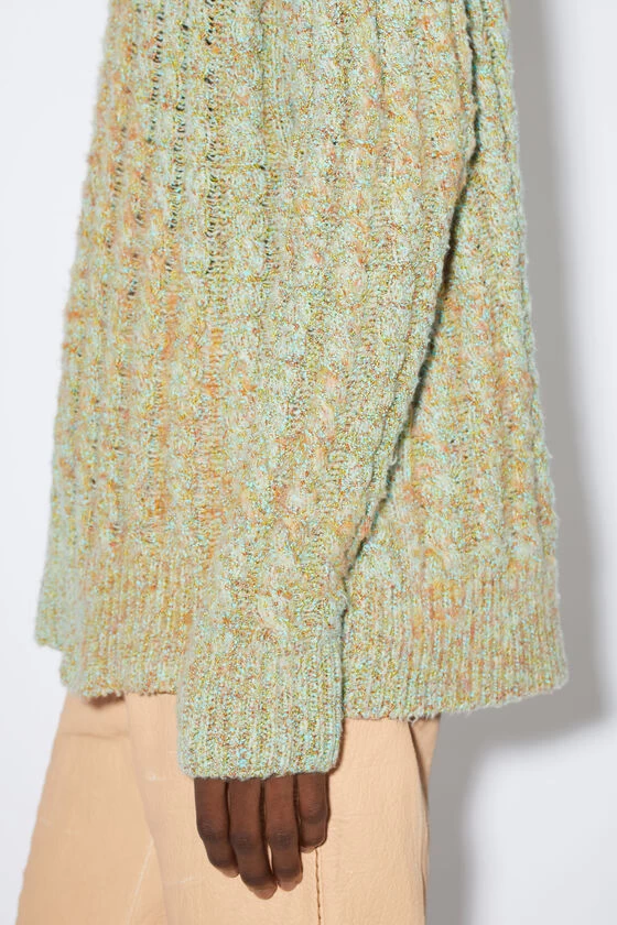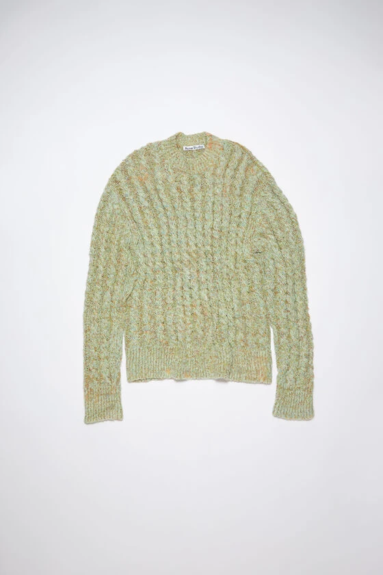 Acne Studios mint green crew neck jumper features an all-over cable knit with a mixed yarn. Cut to a relaxed fit and below the hip length.
