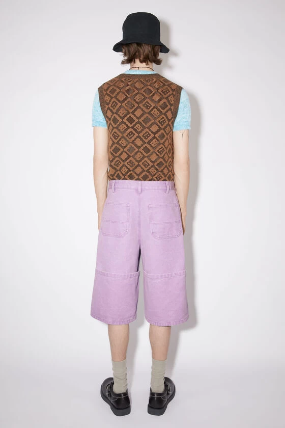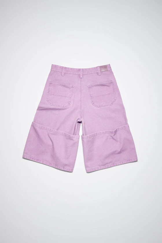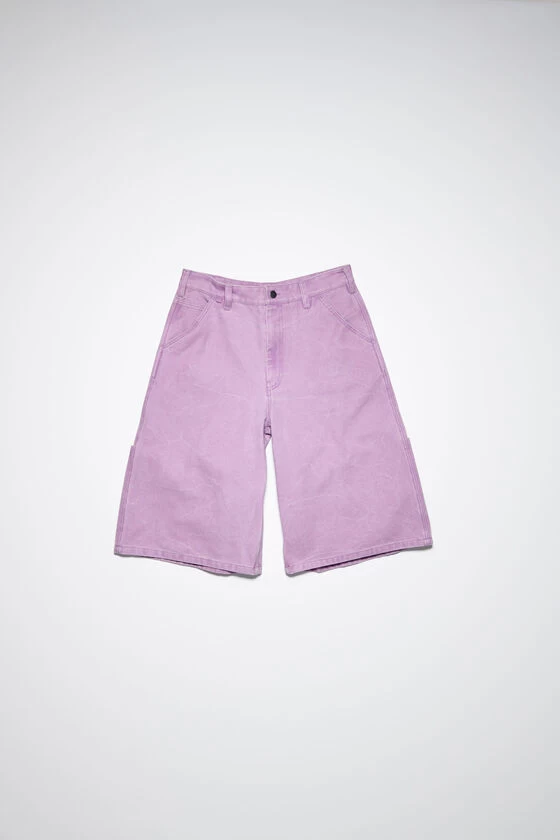 Acne Studios smoky purple shorts are crafted from canvas cotton with a pigment-dyed finish and tape detailing on the back. Adorned with a face logo patch on the back of the waistband. Complete with slanted front pockets a coin pocket and back patch pockets. Cut to regular unisex fit with a mid-rise and knee length.