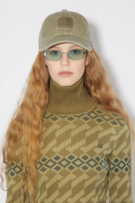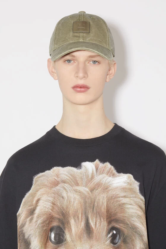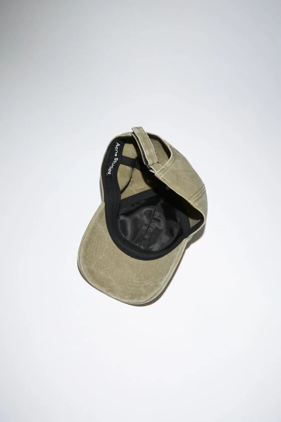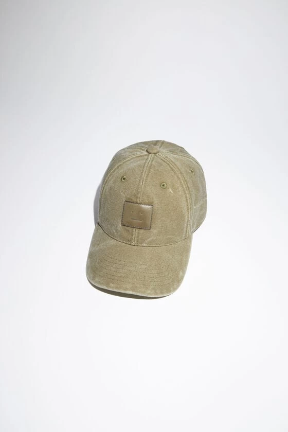 Acne Studios khaki beige six-panel baseball cap is crafted from cotton canvas with a washed finish and detailed with a leather face patch logo patch. Complete with an adjustable velcro closure at the back.