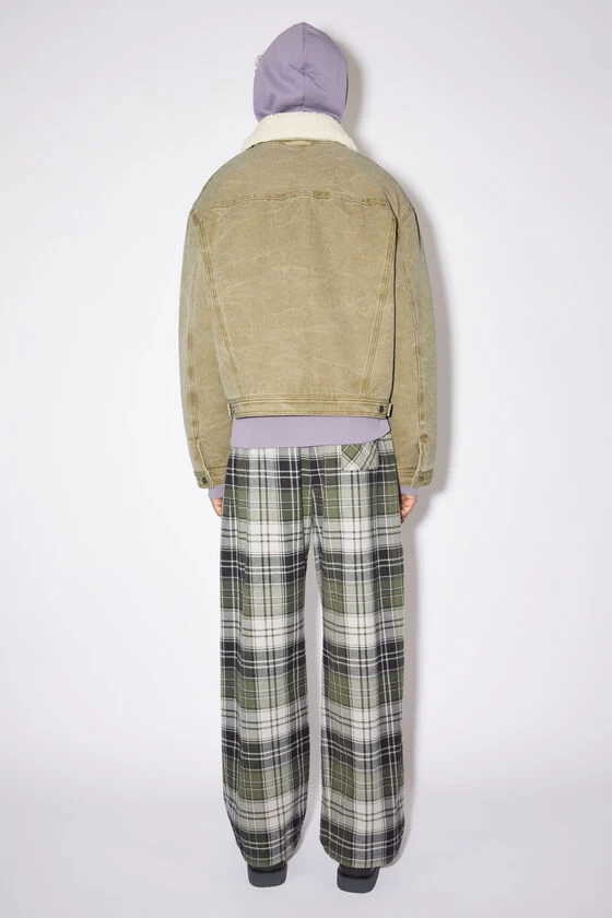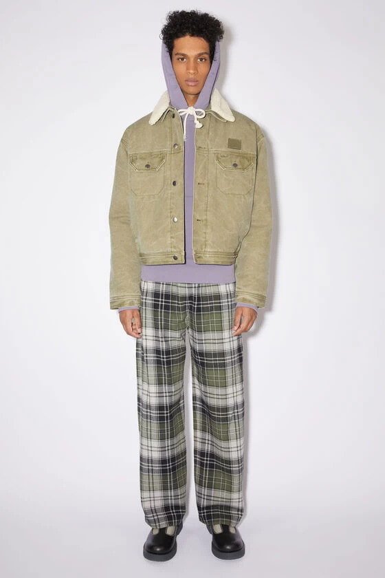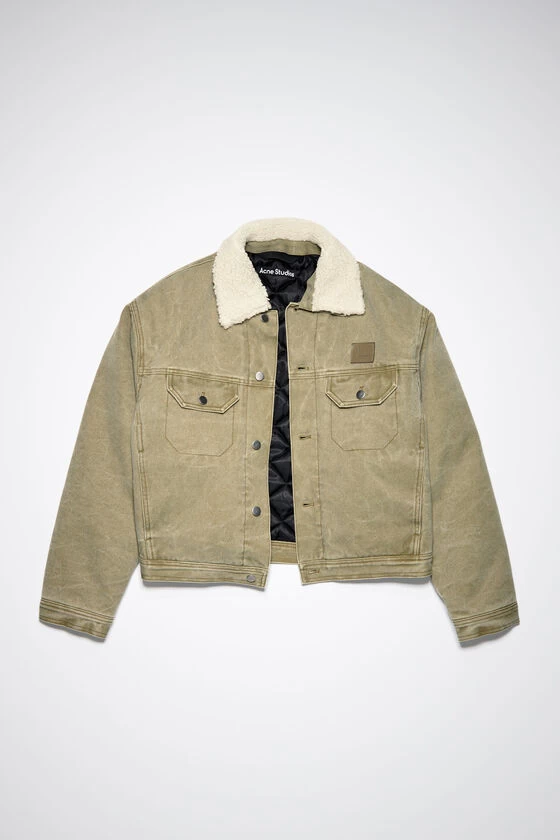 Acne Studios khaki beige jacket is crafted from canvas cotton with a pigment-dyed finish, detailed with a leather face logo patch on the front. Complete with stud button-up closure, quilted padded lining and a detachable collar. Cut to a regular unisex fit with a below waist length.