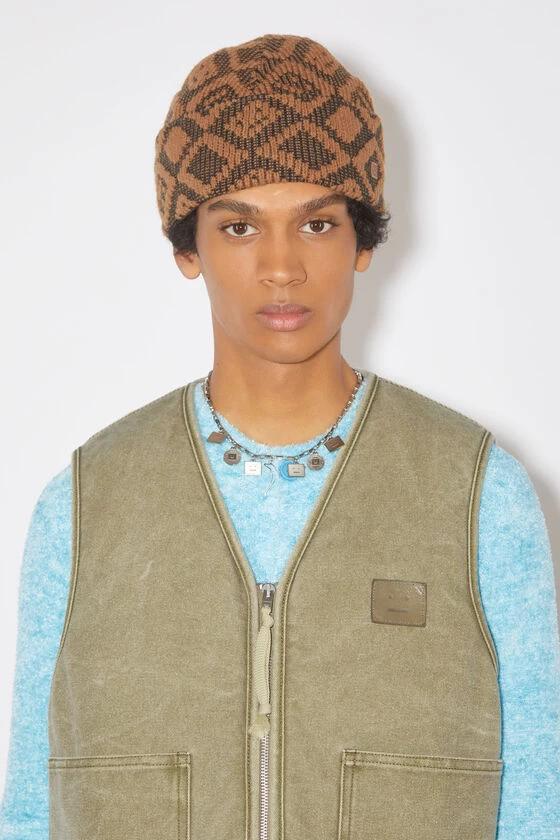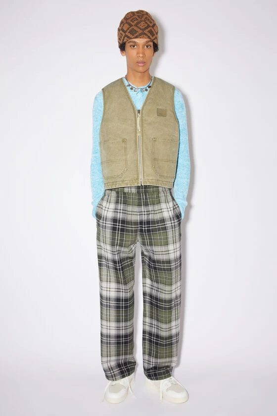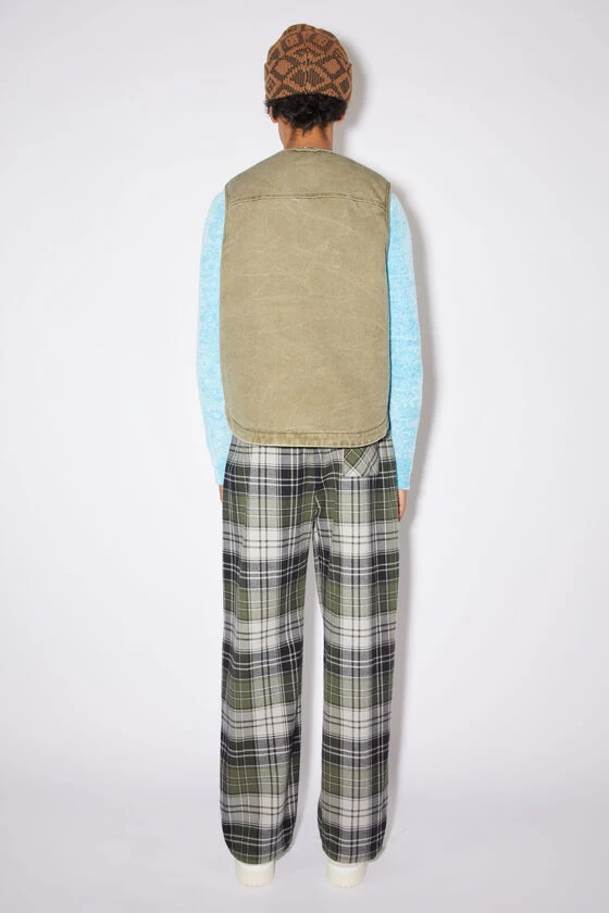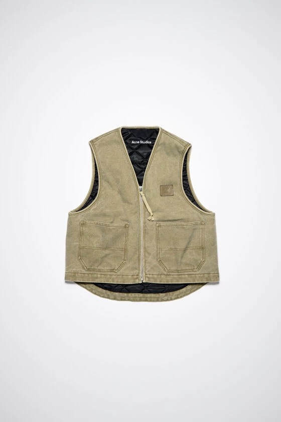 Acne Studios khaki beige vest jacket is crafted from canvas cotton with a pigment-dyed finish, detailed with a leather face logo patch. Complete with a front zipper closure, patch pockets, internal patch pocket with velcro closure and padded quilted lining. Cut to a regular unisex fit with a hip length.
