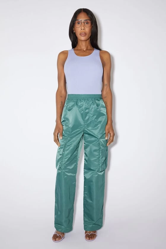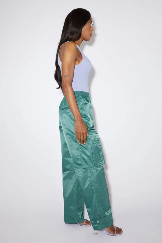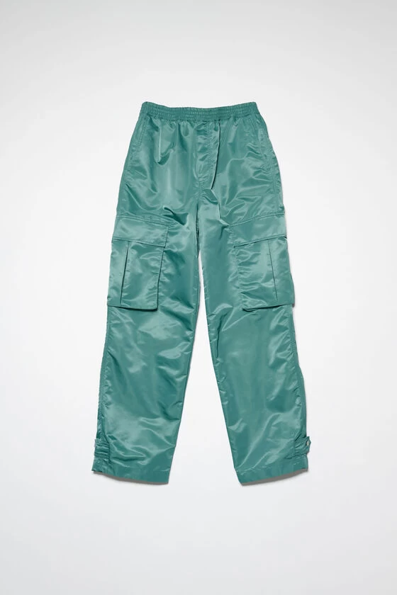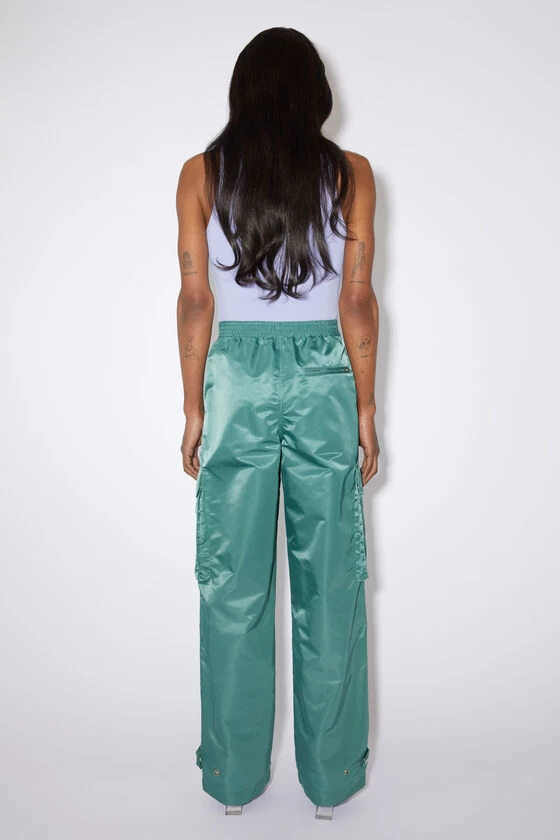 Acne Studios pine green cargo trousers are in collaboration with Honey Fucking Dijon crafted from technical satin made from Nylon with water-repellent finishing. Complete with cargo pockets on the legs, side pockets, back zipper pocket and tab adjusters on the cuffs. Cut to a relaxed unisex fit with an elasticated waistband.