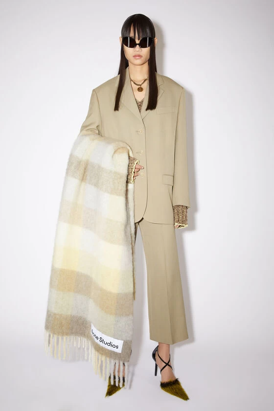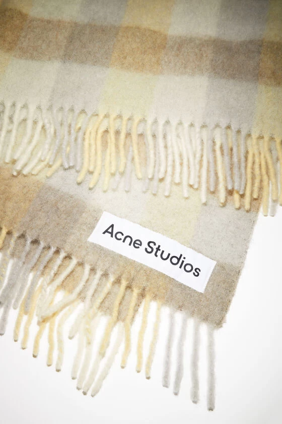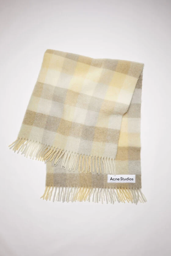 Acne Studios pale yellow/beige grey features a check pattern and is adorned with an Acne Studios logo label. Crafted from an alpaca blend and detailed with fringe ends.