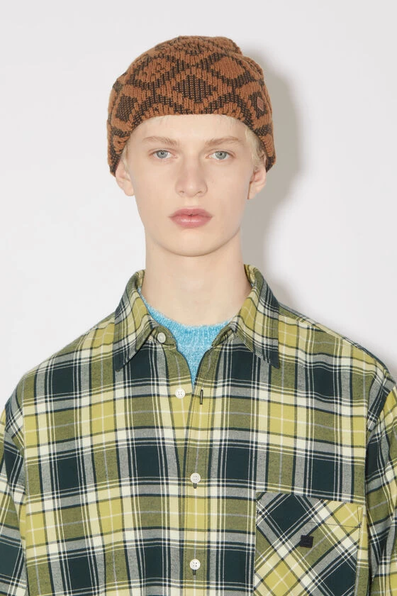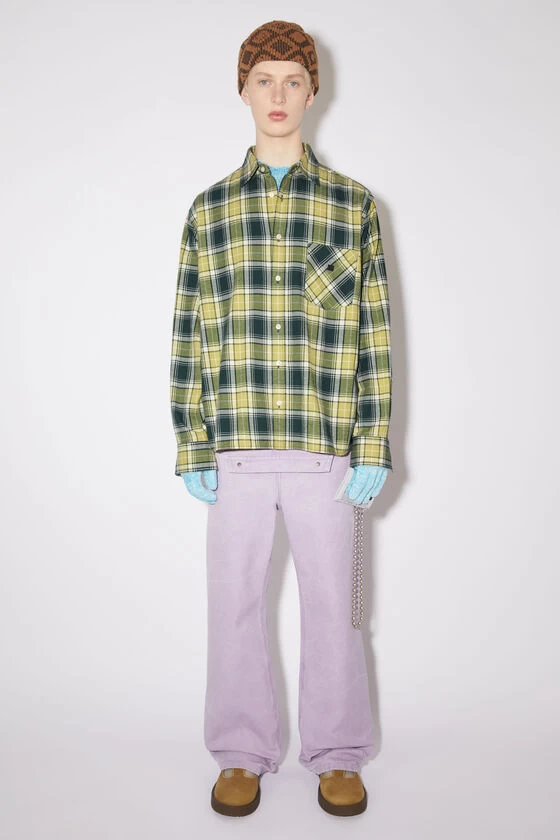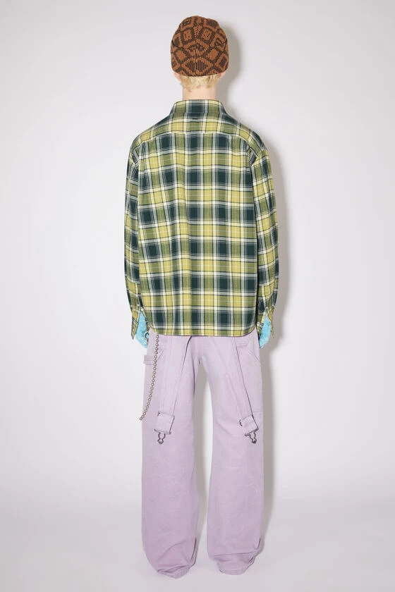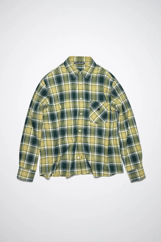 Acne Studios forest green/light green button-up shirt features a check pattern and is crafted from flannel cotton. Detailed with a micro face logo patch on the chest and face logo embroidery on the back of the neck. Cut to a relaxed unisex fit and below the hip length.