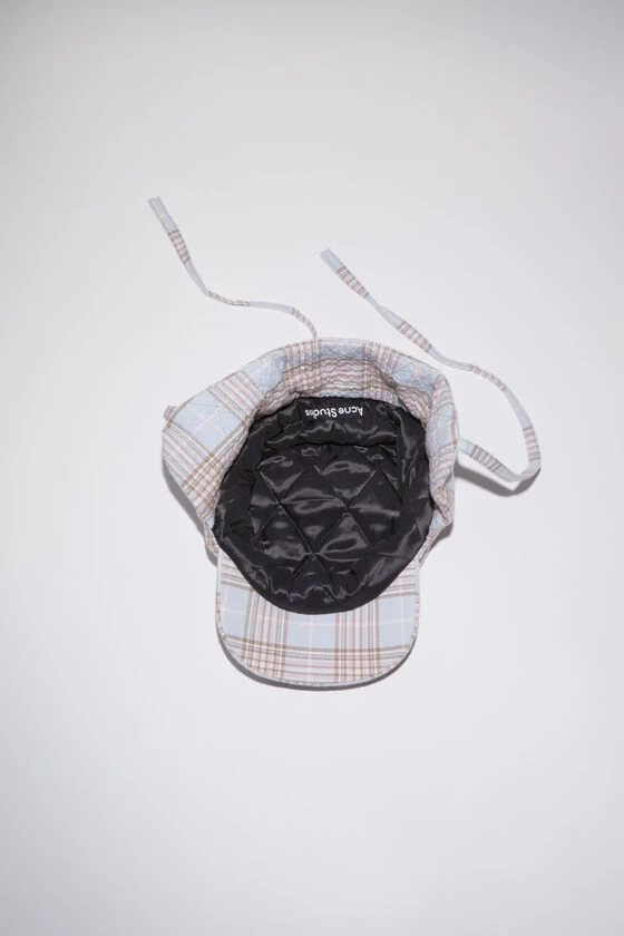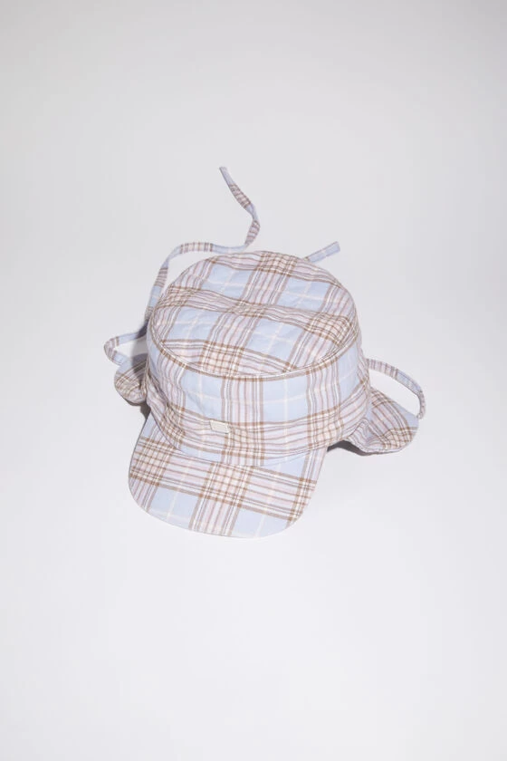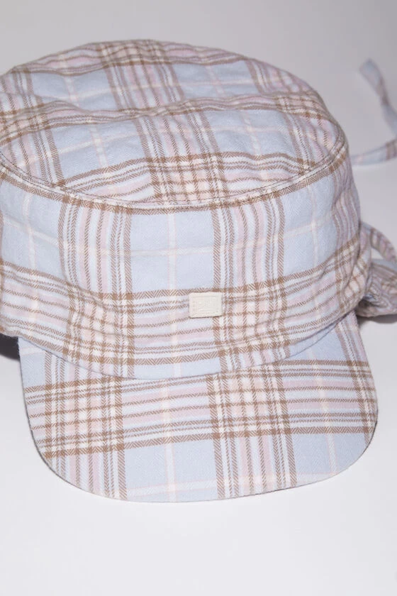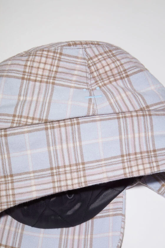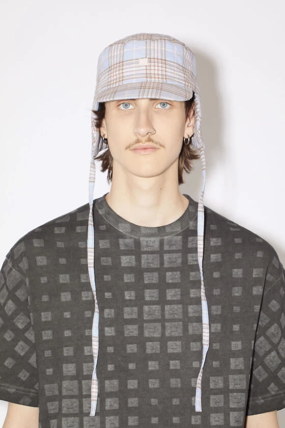 Acne Studios light blue/pink trapper hat features a check pattern and a face logo embroidery. Detailed with a flat brim, ear flaps with ties and crafted from seersucker soft fabric, made of cotton.