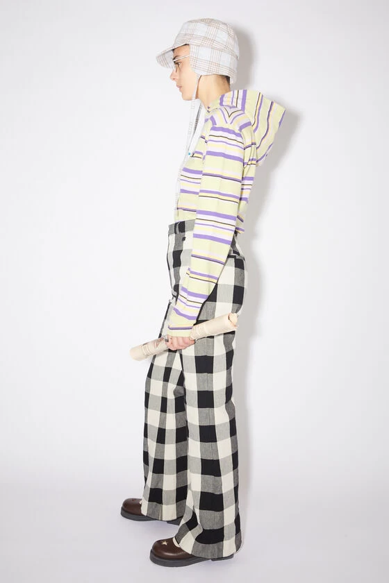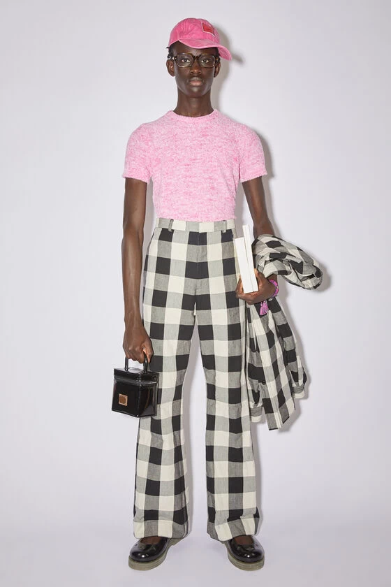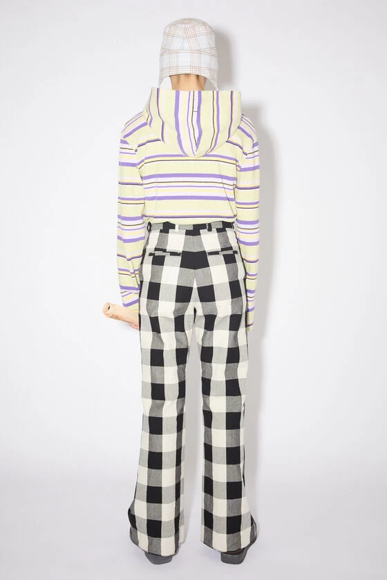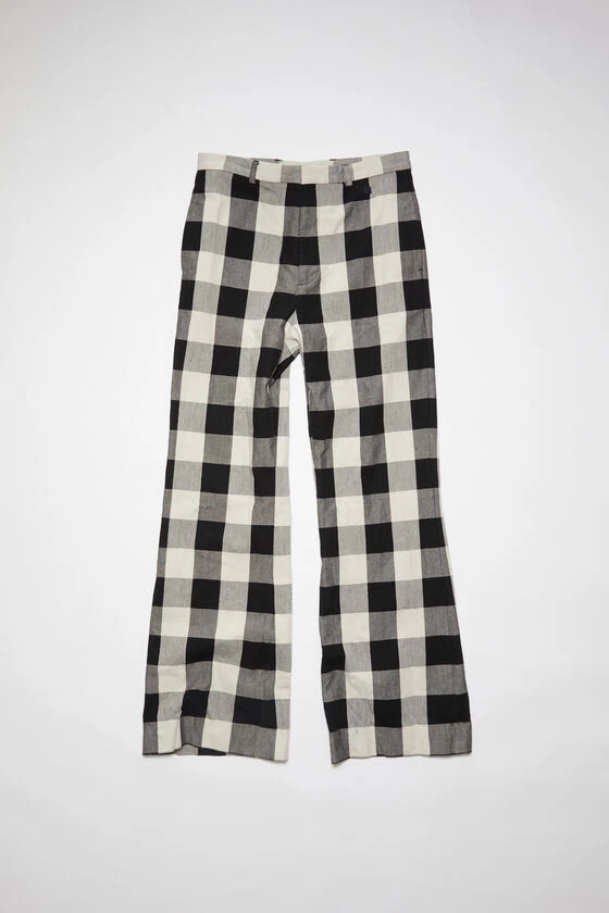 Acne Studios black/white trousers feature an all-over checked print and are detailed with a micro face logo patch on the front and face logo embroidery on the back. Complete with side seam pockets and a back patch pocket.