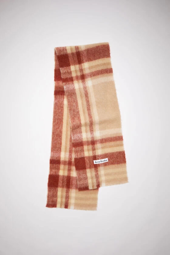 Acne Studios beige/rust red checked scarf is made of felted wool with short frayed ends, and adorned with an Acne Studios logo.