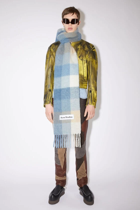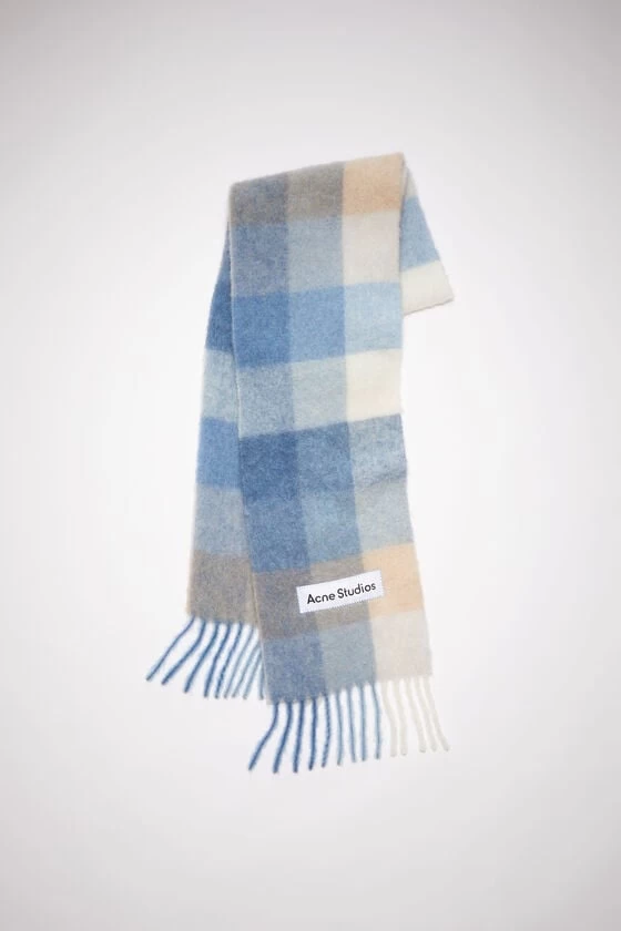 Acne Studios pastel blue/beige checked fringed scarf is detailed with an embroidered Acne Studios label and crafted from a soft wool-mohair blend.
