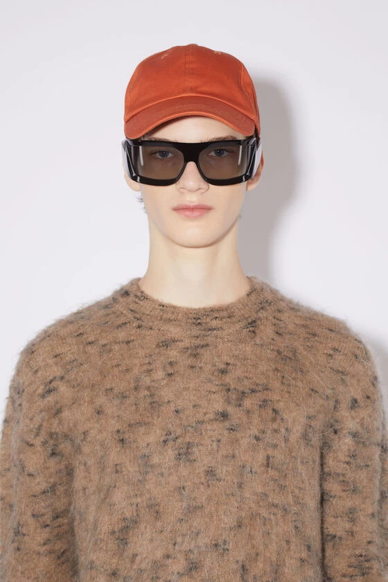 Acne Studios rust red six panel baseball cap is made of cotton twill with an adjustable back.