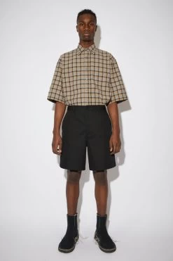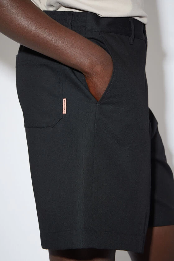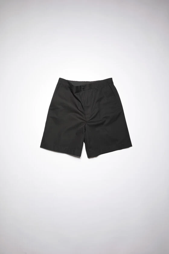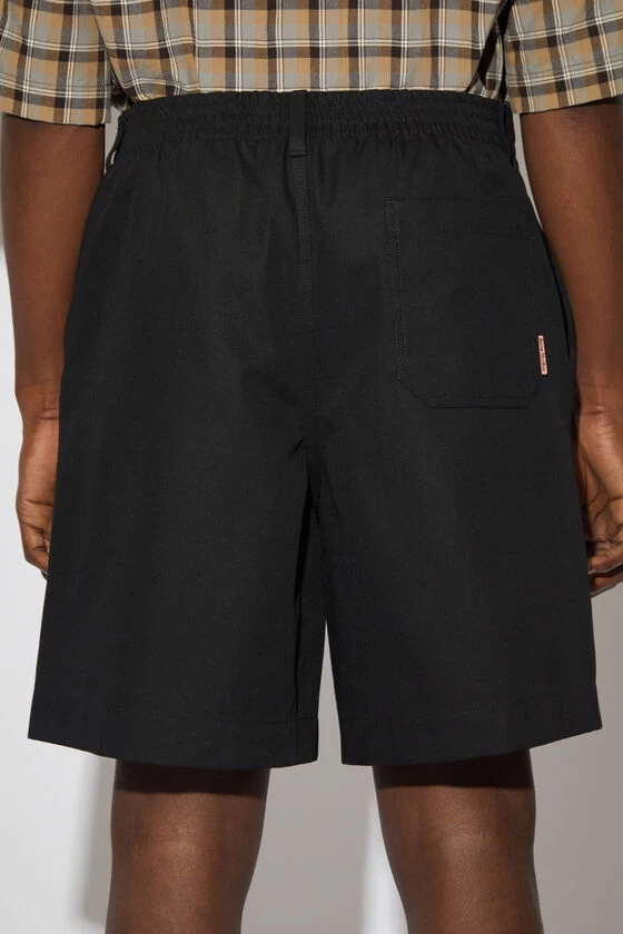 Acne Studios black regular fit casual shorts are made of a cotton blend with an elasticated waistband at the back and a crisp, workwear-inspired silhouette. Accented with a pink Acne Studios logo on the back pocket.