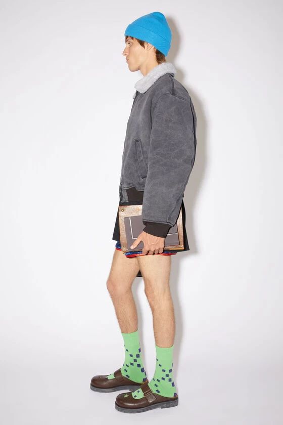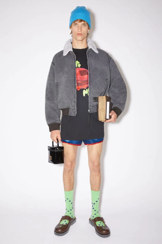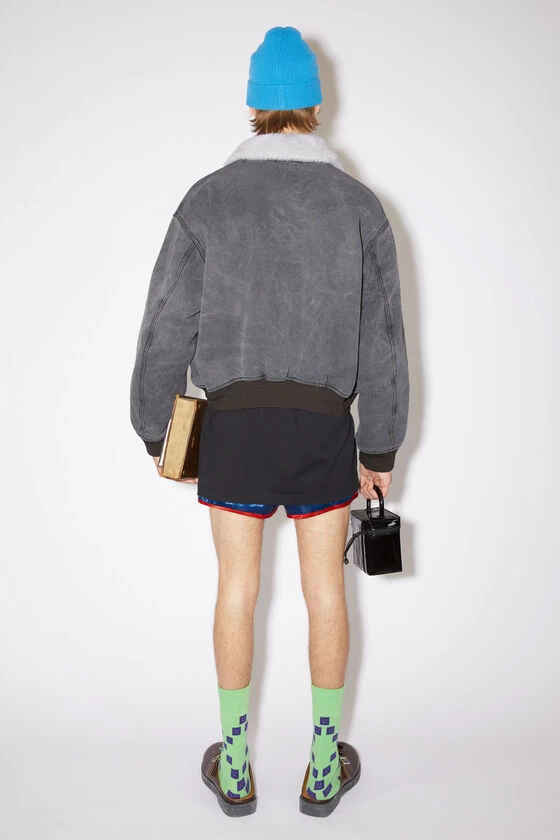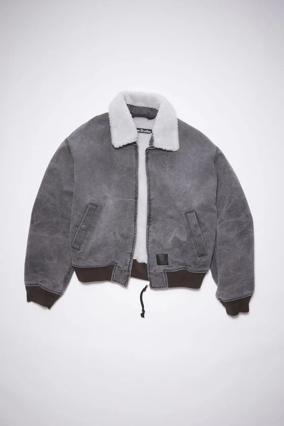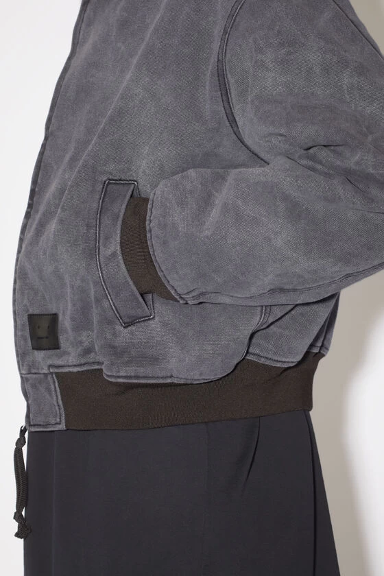 Acne Studios carbon grey bomber jacket features a detachable contrast collar, matching the interior lining and is detailed with a leather face logo patch. Complete with a zippered front closure, side pockets and contrast ribbed cuffs and hem. Crafted from pigment-dyed cotton canvas and cut to a relaxed fit.