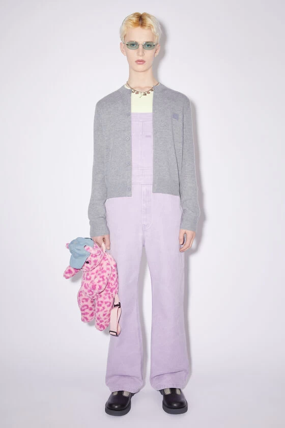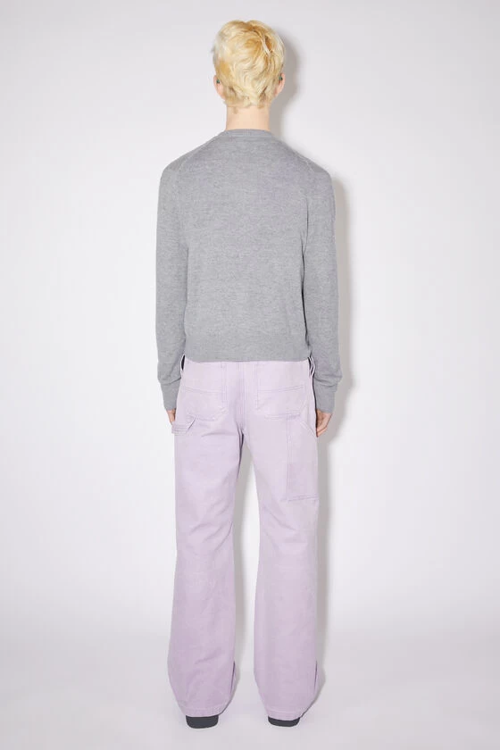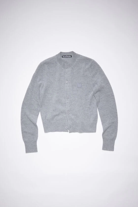 Acne Studios grey melange crew neck cardigan features a tonal face logo patch and is made of lightweight wool. Completed with ribbed collar, cuffs, and hem detailing. Cut to a regular unisex fit and a slightly cropped length.