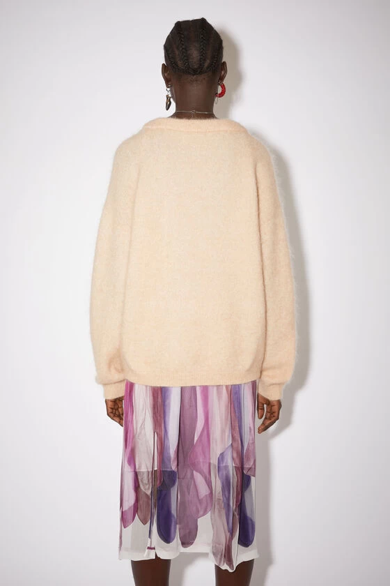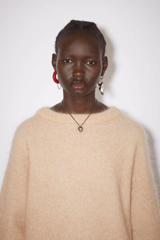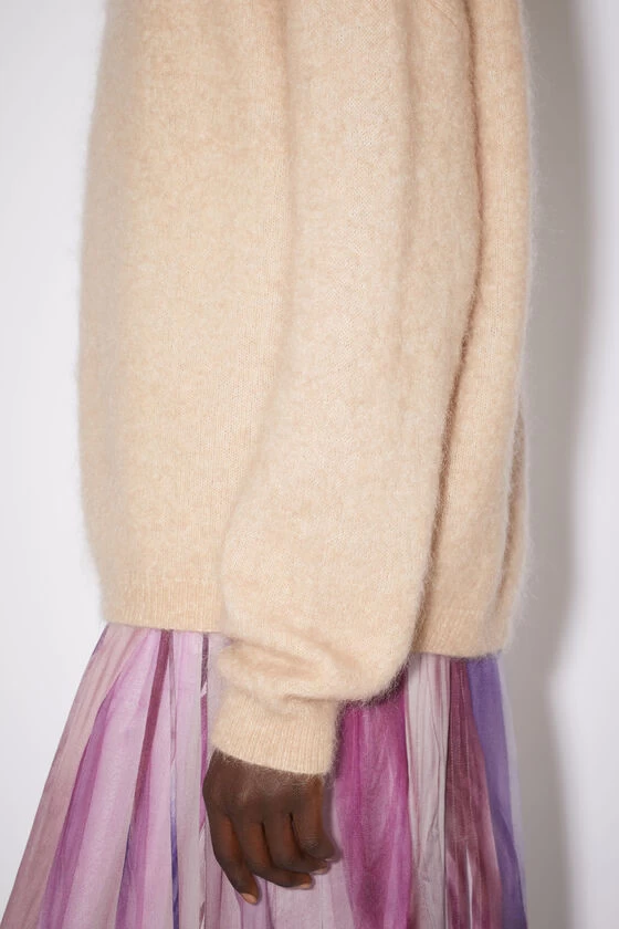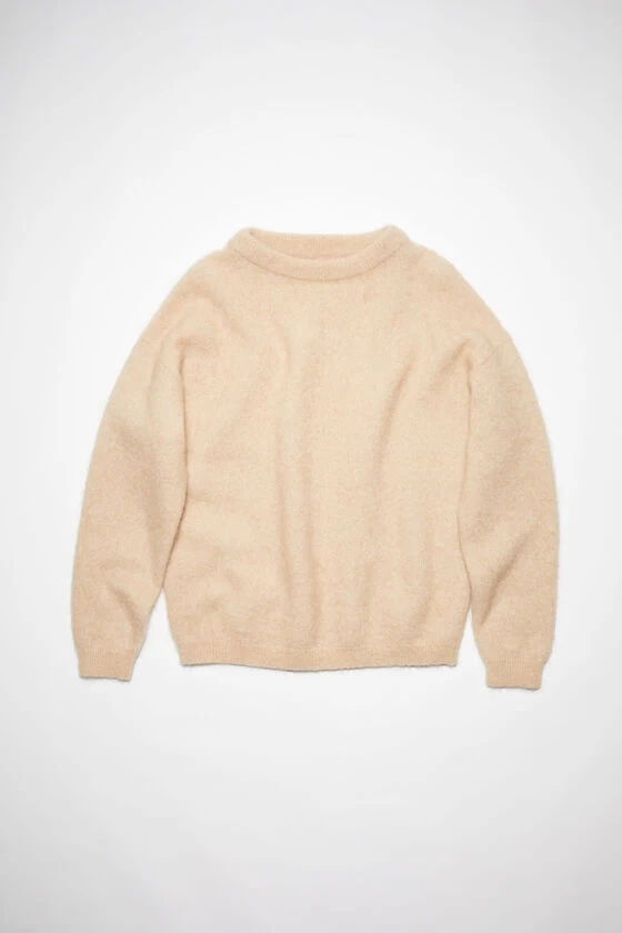 Acne Studios warm beige crew neck jumper is crafted from a mohair-wool blend and is cut to a relaxed fit with dropped shoulders.
