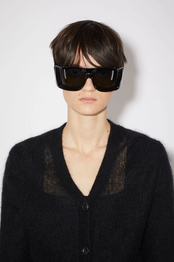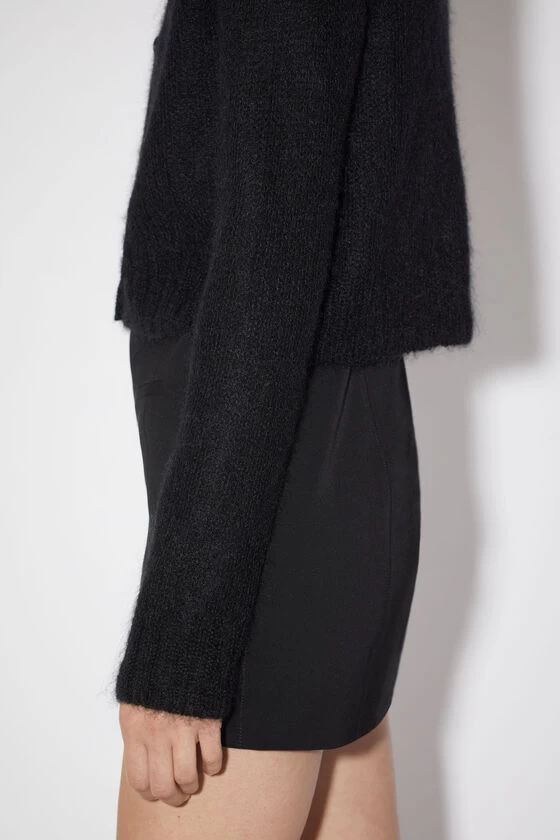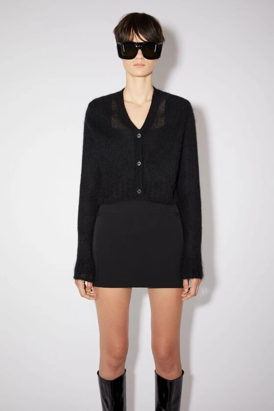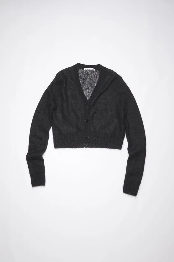 Acne Studios black cardigan is crafted from a soft open knit jersey made of a mohair blend. Cut to a regular fit with a cropped length, and completed with a button-up opening.