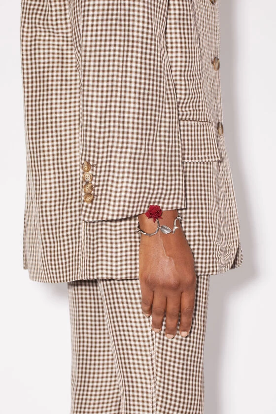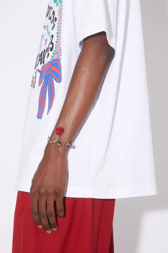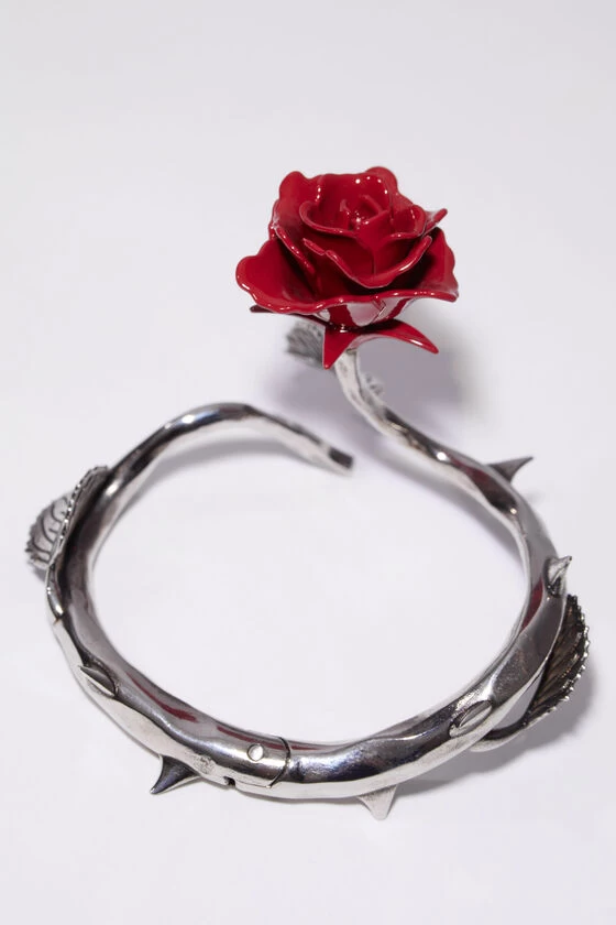Acne Studios antique silver/red cuff bracelet features a sculptural contrast rose with tonal spike and leaf details.