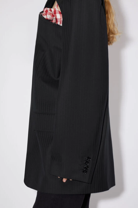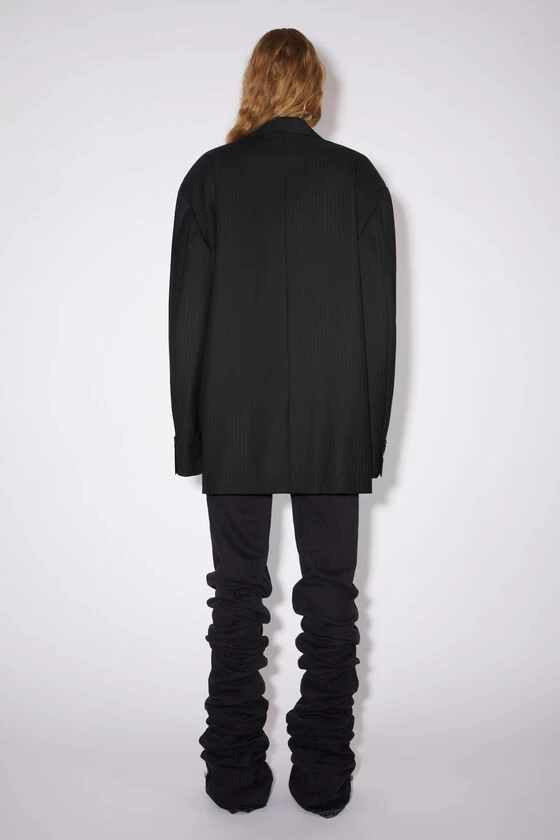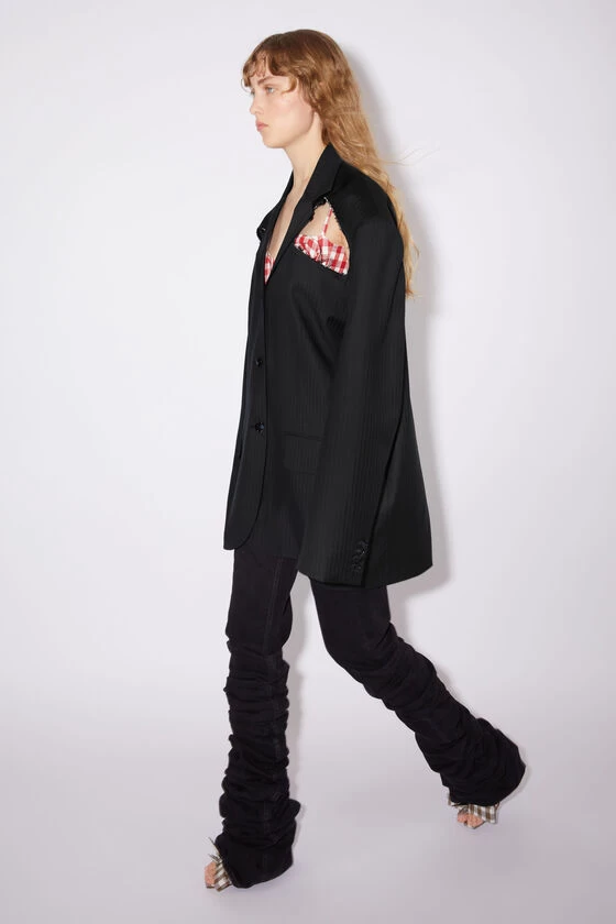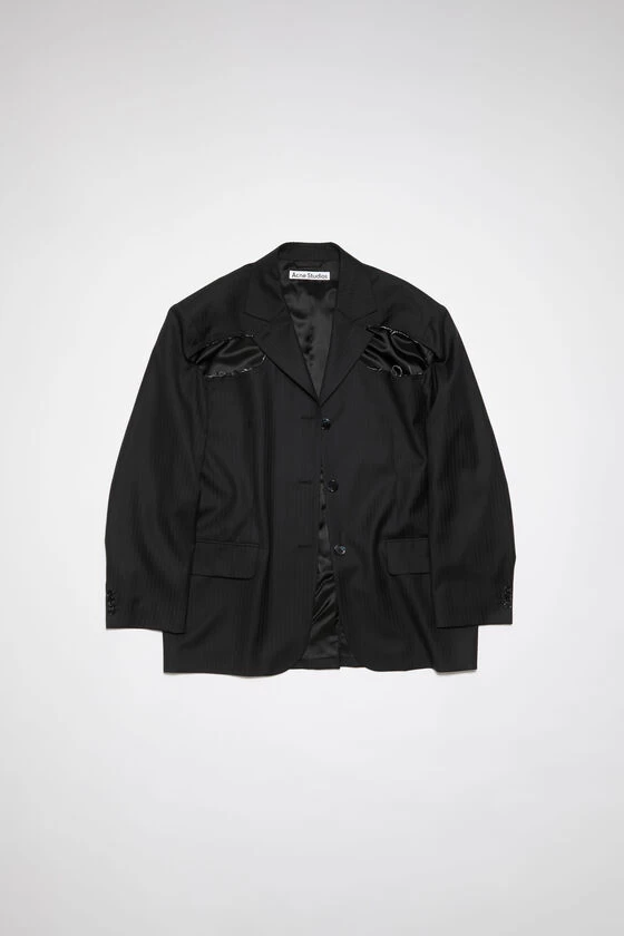 Acne Studios black single-breasted tailored jacket is crafted from wool and features raw cut-out edges. Complete with a centre front button-up closure and front pockets. Cut to a relaxed fit with dropped shoulders and below the hip length.