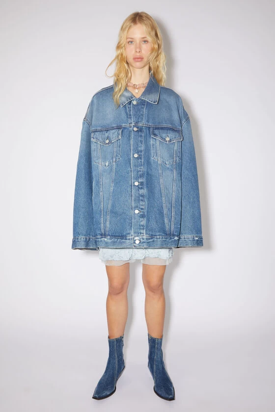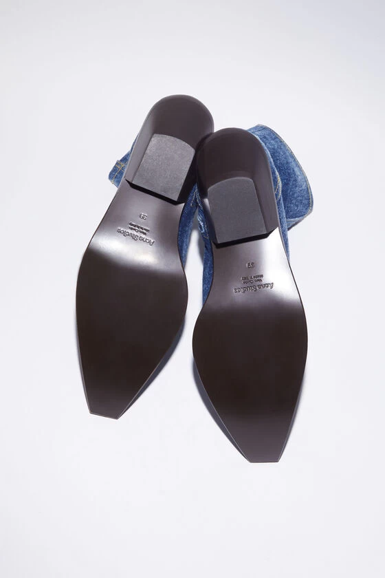 Acne Studios denim blue ankle boots are crafted from leather with a washed denim finish. Complete a pointed toe and western heel.