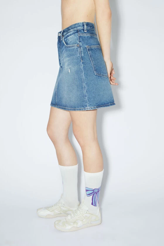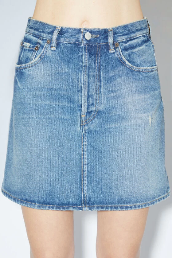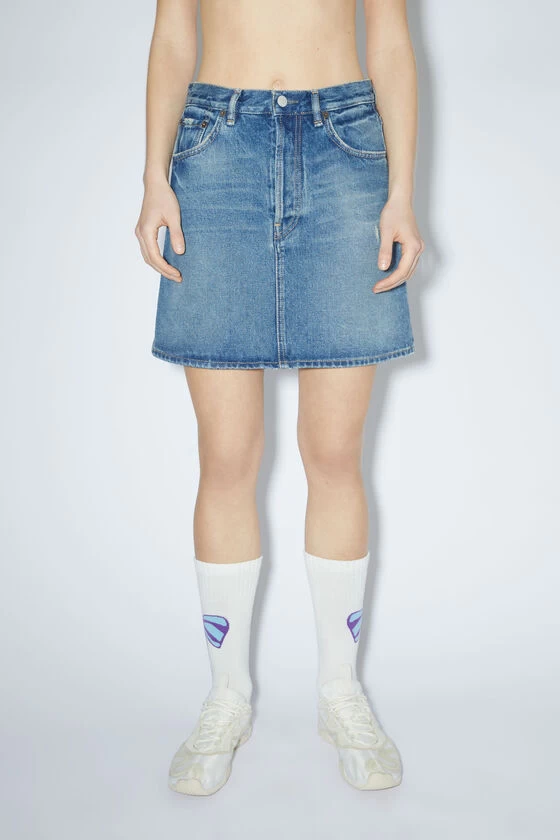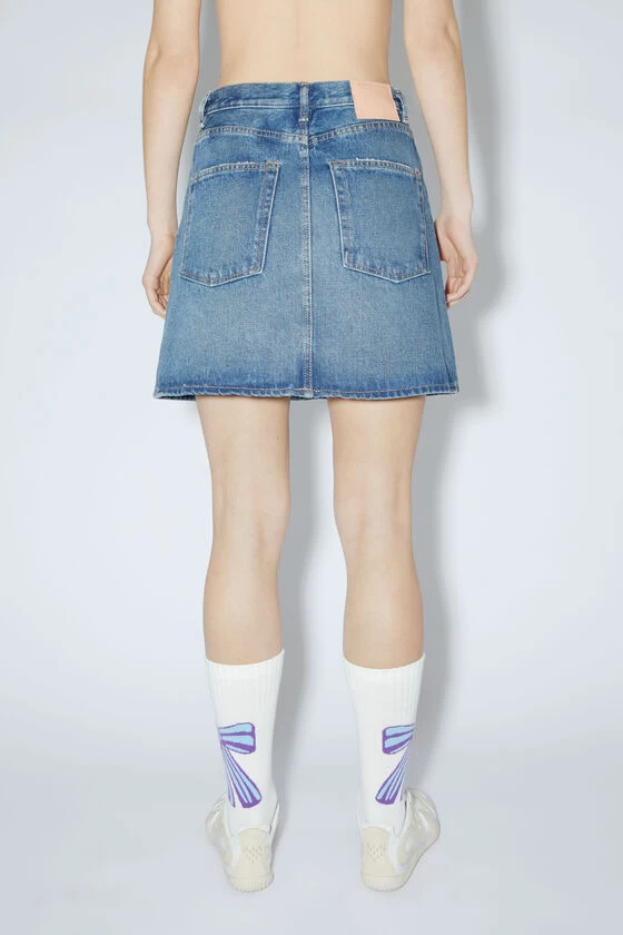 Acne Studios mid blue denim mini skirt is cut to a relaxed a-line silhouette with a high rise and mid-thigh length.