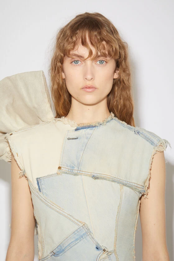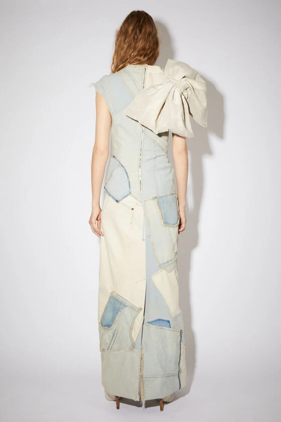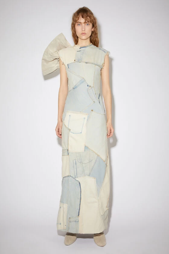 Acne Studios light sand dress features tonal patchwork, crafted from denim made of cotton. Adorned with frayed detailing on the neckline and sleeve openings. Cut to a fitted silhouette with a long length.