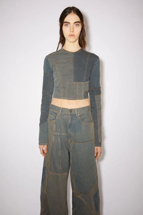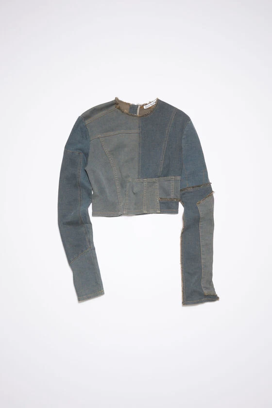 Acne Studios dark brown/beige long-sleeve top features a denim patchwork and is detailed with a frayed raw neckline and hem. Cut to a fitted silhouette and a cropped length.
