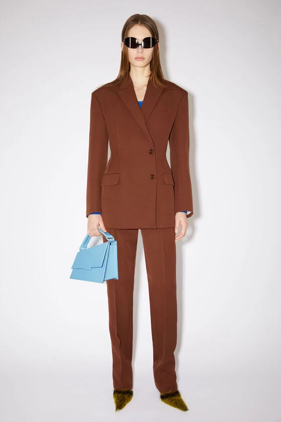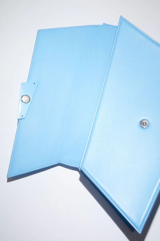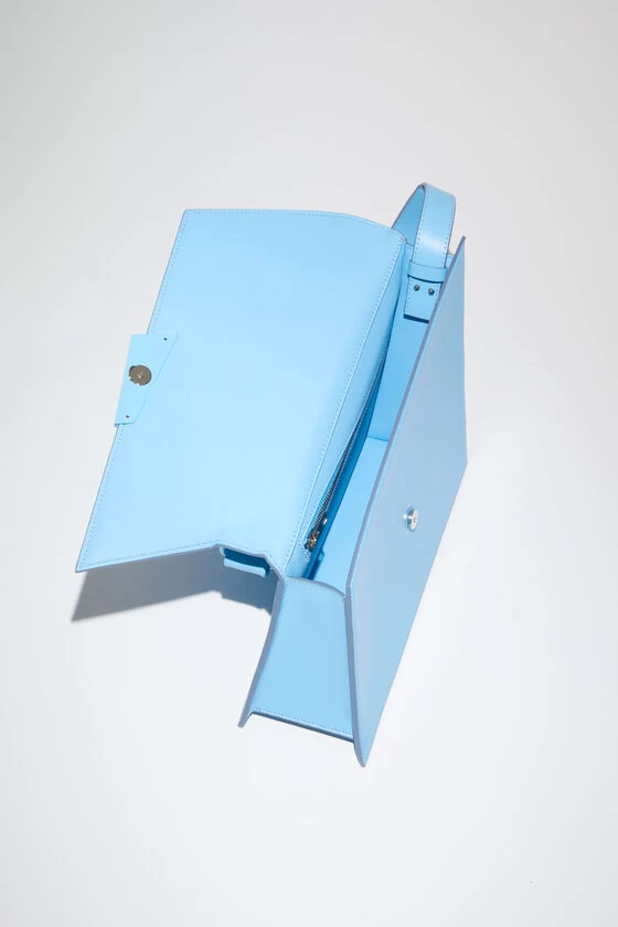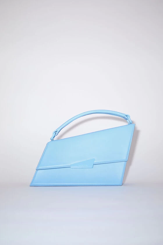Acne Studios azure blue distortion handbag features a distorted silhouette with a top handle and removable crossbody strap. Made of semi-shiny leather, completed with logo engraving and tonal hardware.