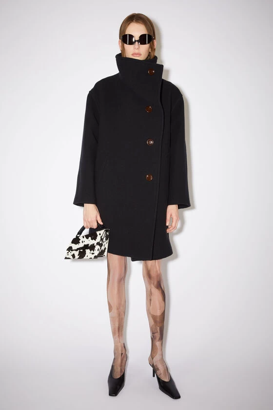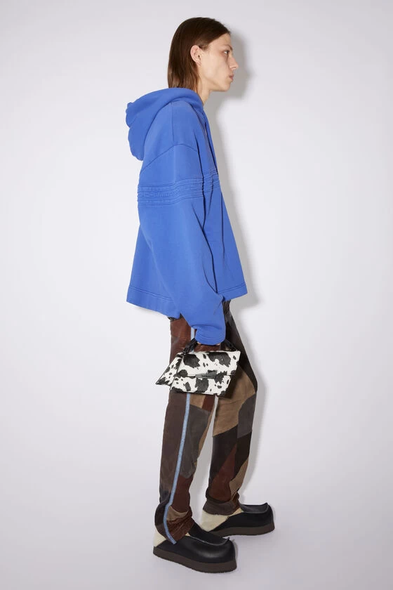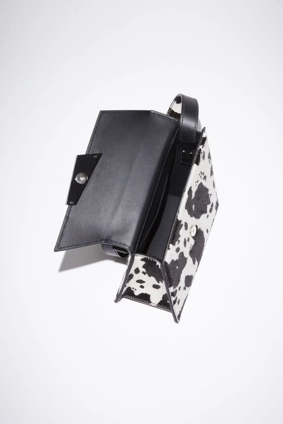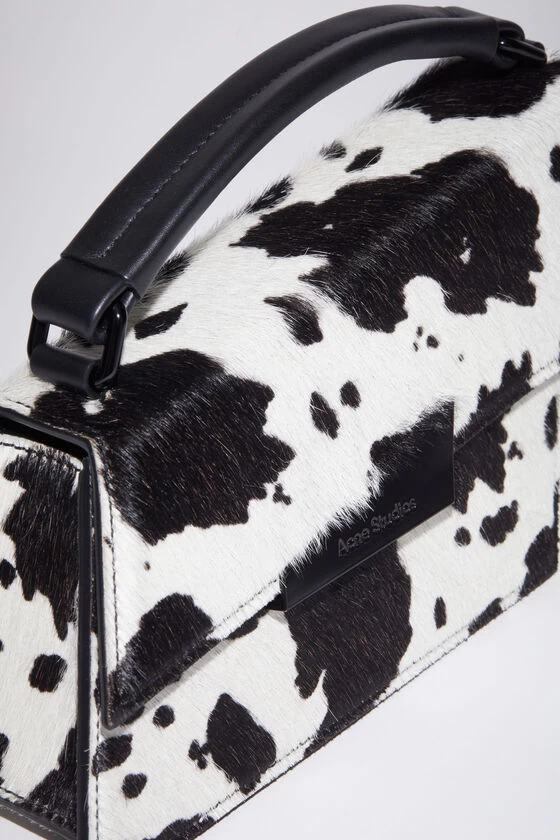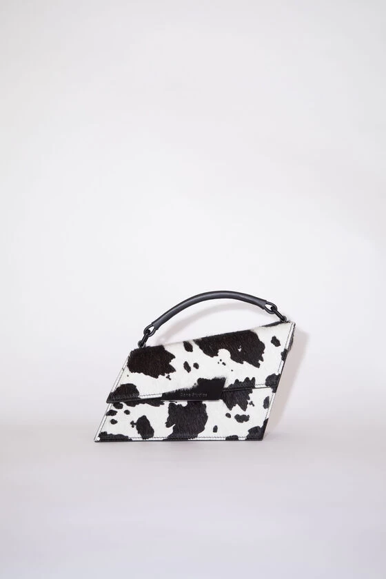 Acne Studios white/black distortion mini bag features a distorted silhouette with top handle and removable crossbody strap. Detailed with a hairy cow print crafted from leather and completed with a logo engraving a tonal hardware.
