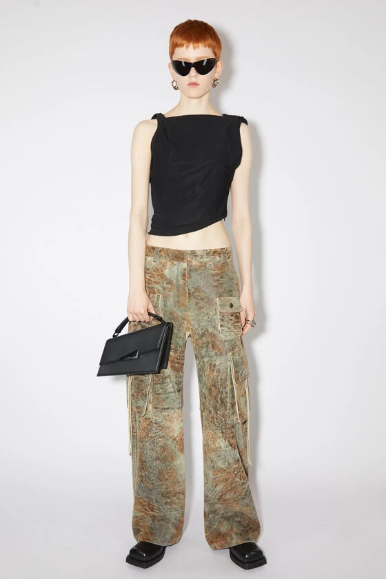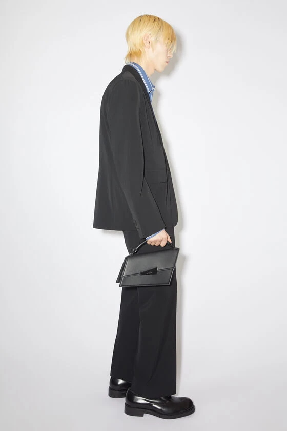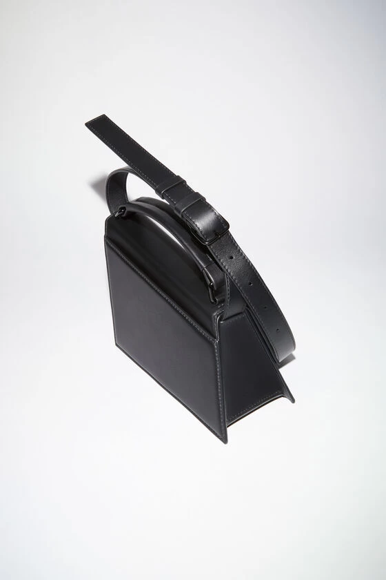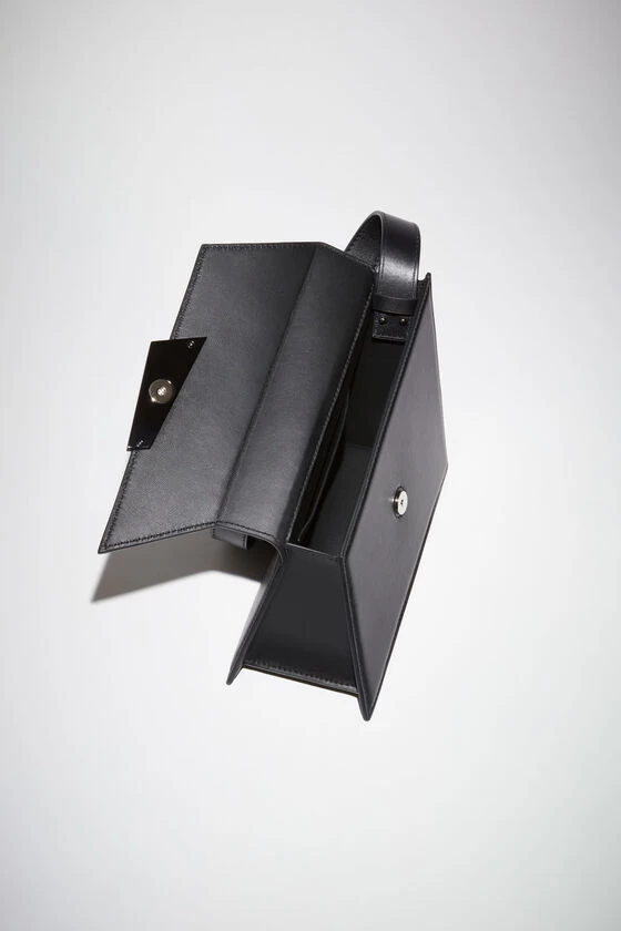 Acne Studios black distortion mini bag features a distorted silhouette with a top handle and removable crossbody strap. Made of semi-shiny leather, completed with logo engraving and tonal hardware.