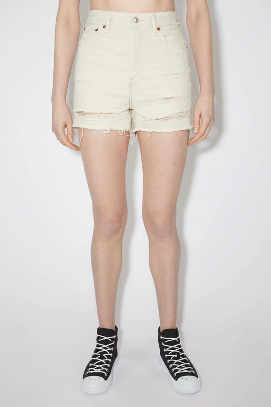 Acne Studios white denim shorts are cut to a fitted silhouette and high waist. Detailed with distressed details and raw hem, crafted from rigid denim made of cotton.
