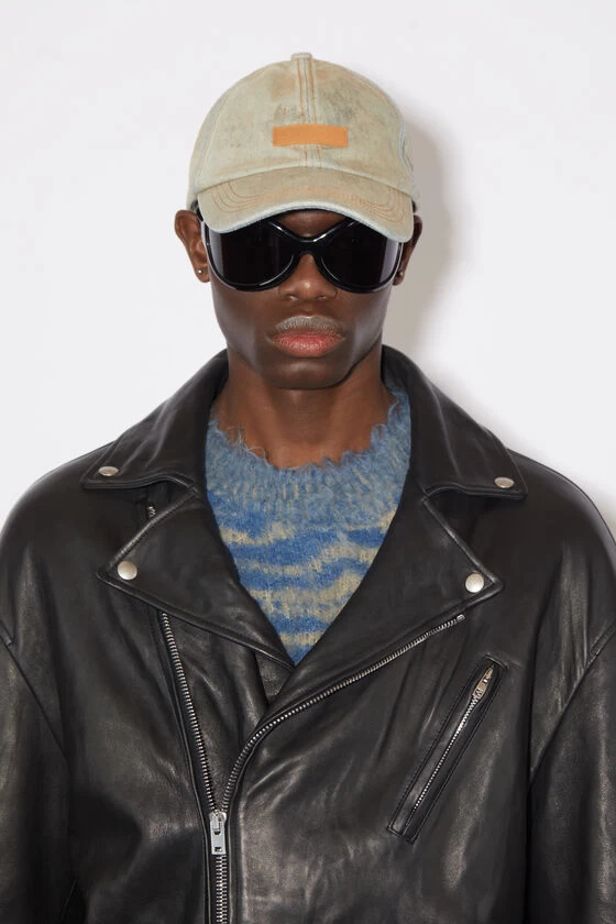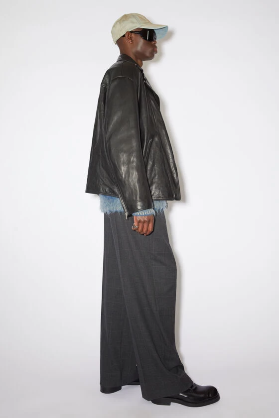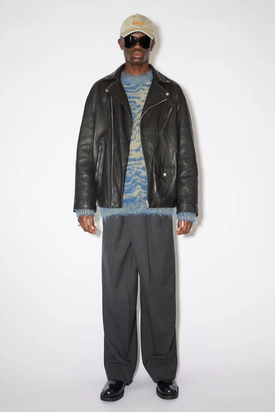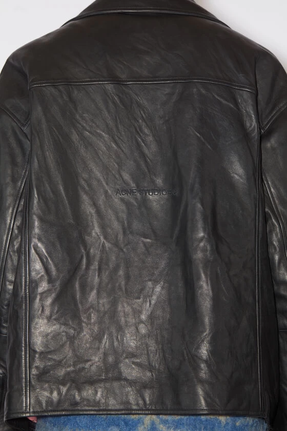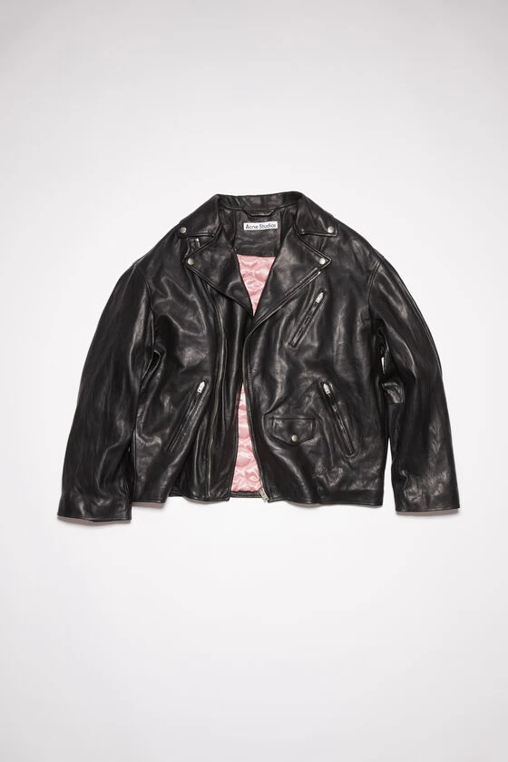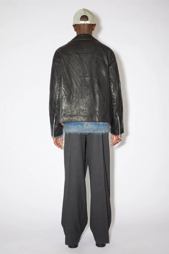Acne Studios black biker jacket is crafted from leather with a soft distressed appearance, detailed with zippered details, pockets and front closure. Complete with a snap fastening at the collar, lapel and a front patch pocket. Cut to a relaxed fit with a below hip length.