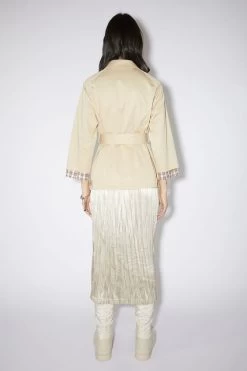 Acne Studios ecru/white ribbed knit dress is crafted from a wool blend and adorned with distressed details and a neckline with a scarf. Cut to a relaxed fit and a long length.
