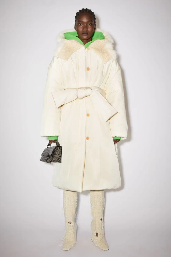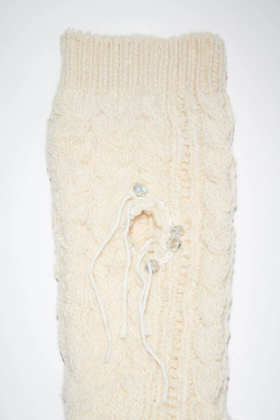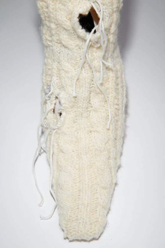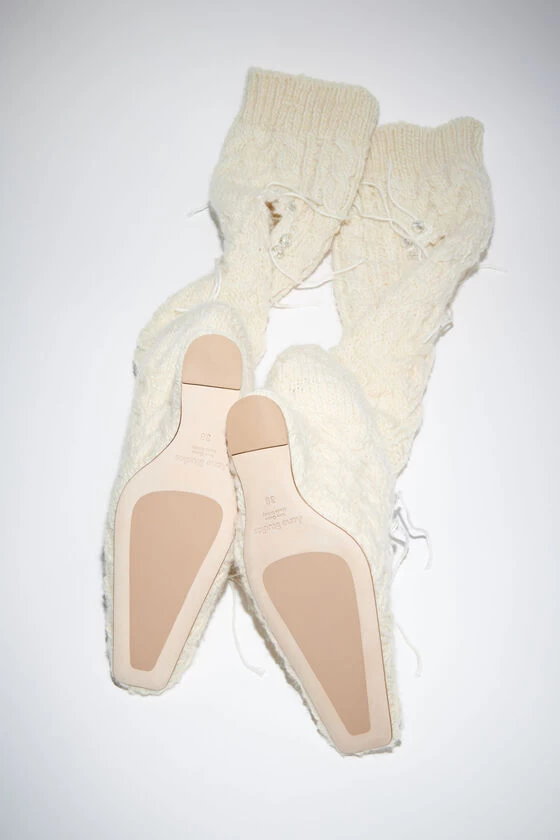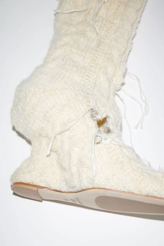 Acne Studios cream beige boots are crafted from merino wool and adorned with distressed details. Complete with a pointed-toe and sculptural platform heel.