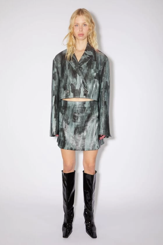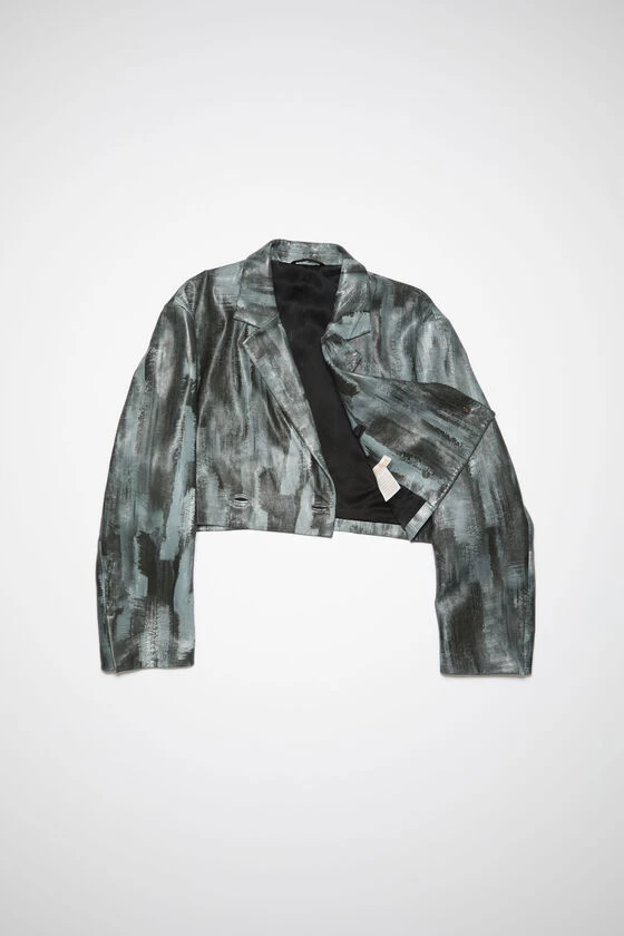Acne Studios black double-breasted jacket is crafted from leather with a painted effect, constructed entirely from excess fabrics and materials. Detailed with a button-up closure and a welt pocket on the chest. Cut to a regular fit with a cropped length.