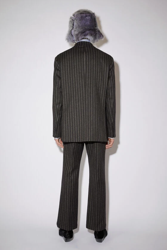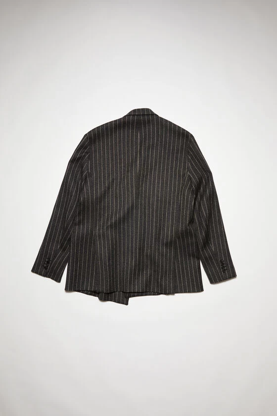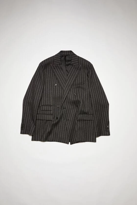 Acne Studios dark grey double-breasted jacket features a pinstripe pattern and is crafted from wool-blend. Detailed with front jet pockets with flaps, a chest pocket and cut to a regular silhouette.
