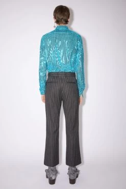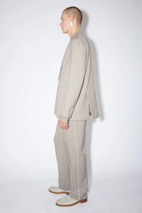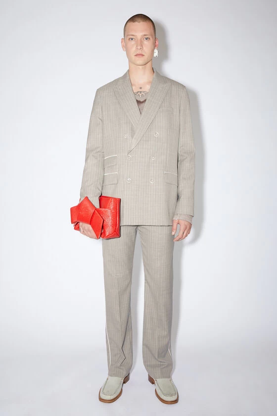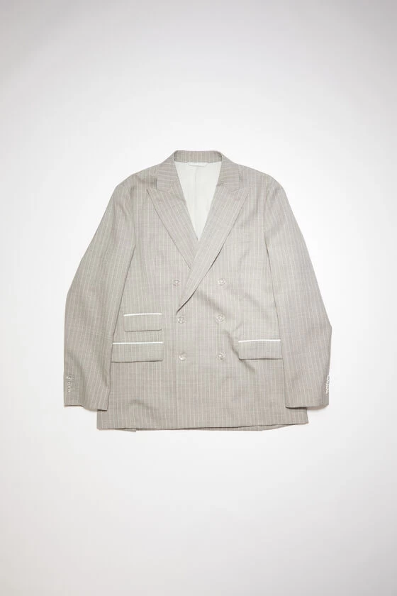 Acne Studios pearl grey double-breasted suit jacket is crafted from wool. detailed with peaked labels, contrast flap pockets and a chest pocket. Cut to a regular fit and length.