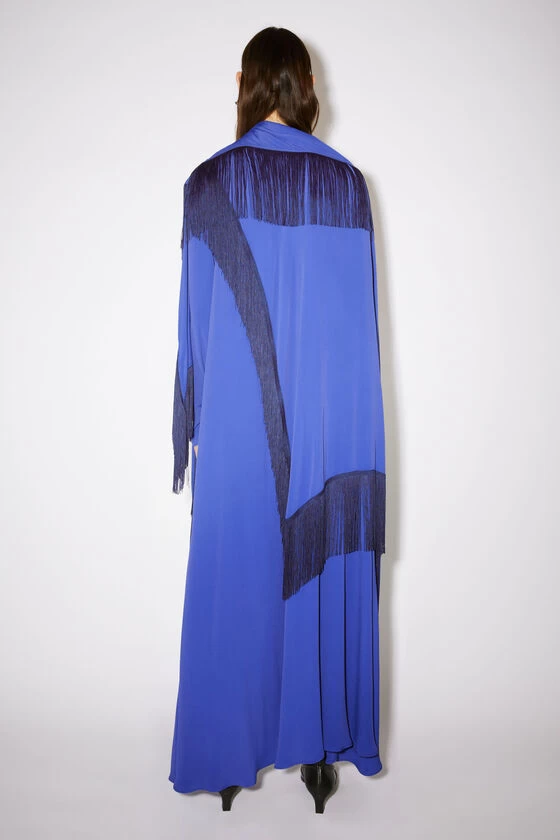 Acne Studios electric blue dress features a contrasting fringe detailing with a wrapped and layered appearance. Cut to a relaxed fit with a high neckline, elongated sleeves and a floor length.
