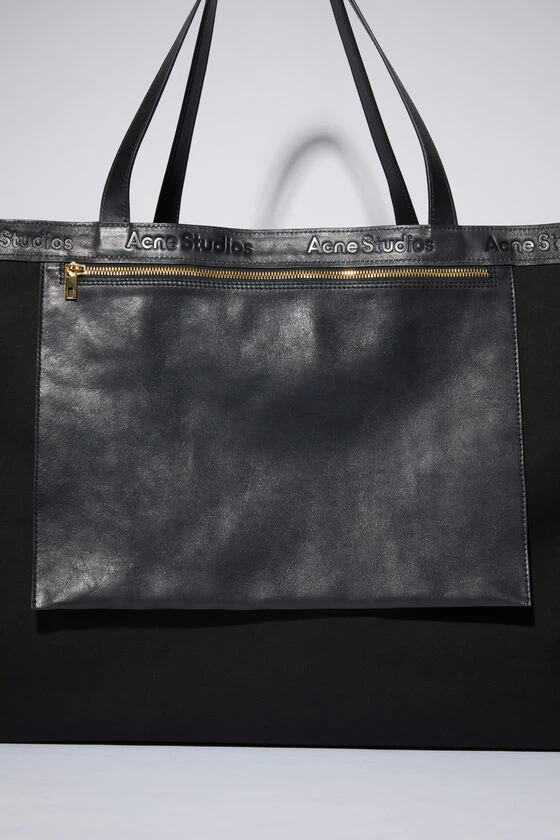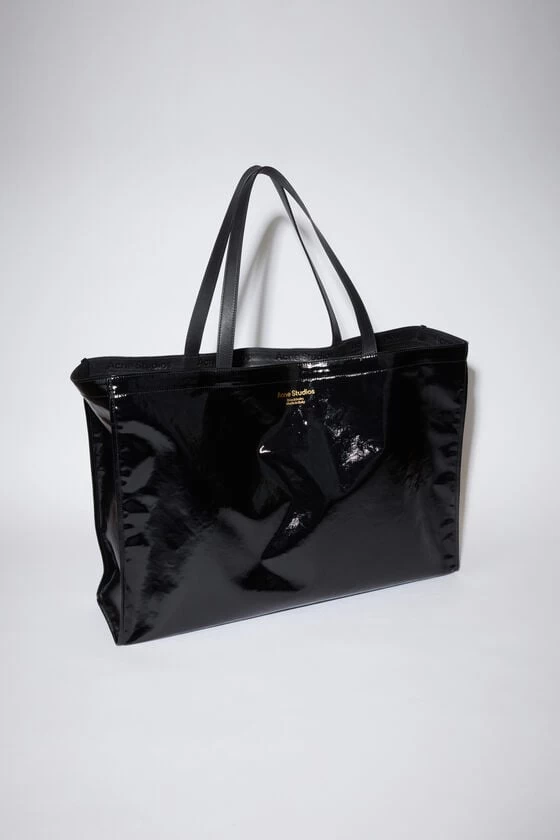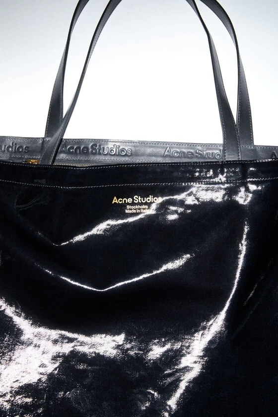 Acne Studios black East-West tote bag is made of a cotton fabric with a shiny coating and features a gold foil Acne Studios logo stamp.