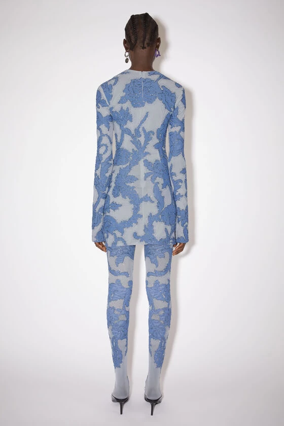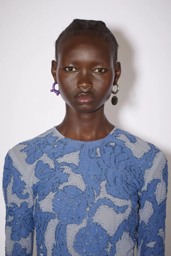 Acne Studios blue dress features flower patchwork details adorned with hand-embroidered glass beads. Crafted from an elasticated mesh fabric, cut to a fitted silhouette with elongated flared long sleeves and a mini length.