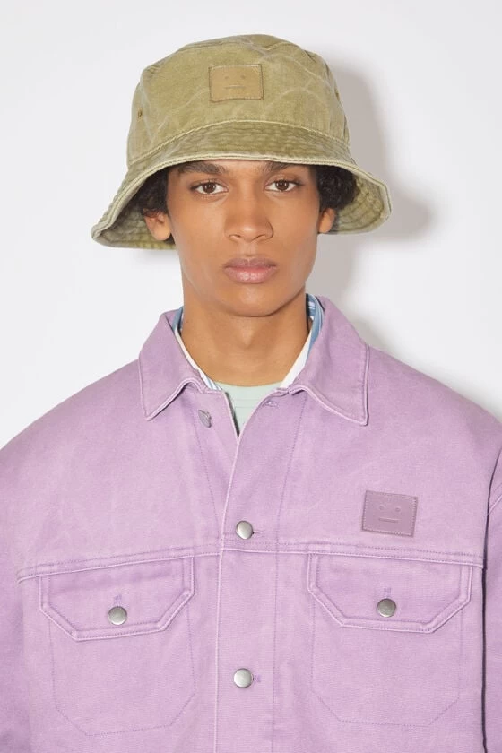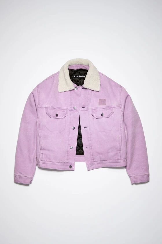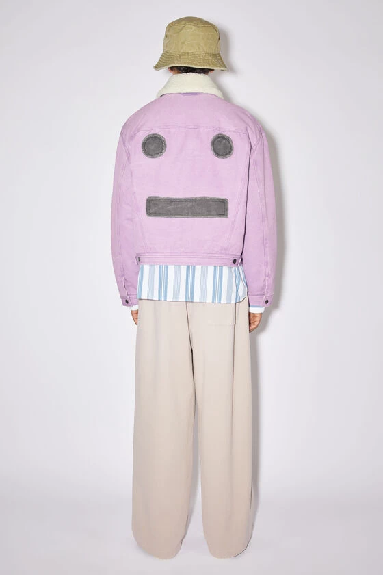 Acne Studios smoky purple jacket is crafted from canvas cotton with a pigment-dyed finish, detailed with a contrast face logo on the back and a leather face logo patch on the front. Complete with stud button-up closure, quilted padded lining and a detachable collar. Cut to a regular unisex fit with a below-waist length.