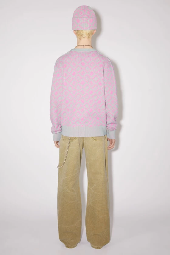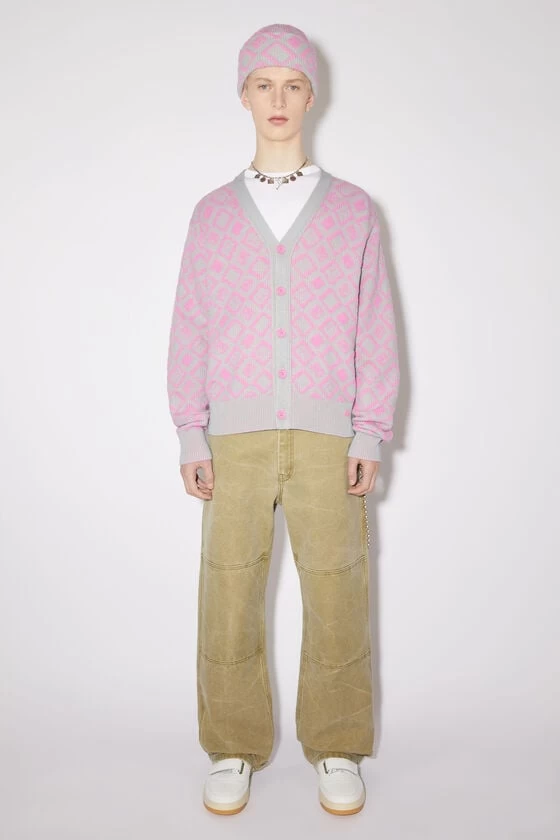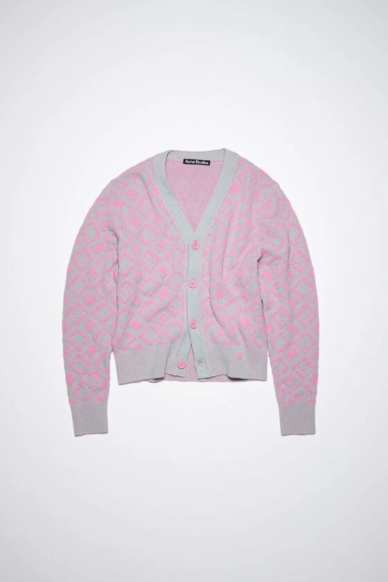 Acne Studios bubble pink/spring green cardigan features an all-over face tiles animation, detailed with a micro face logo patch on the hem side. Crafted from a wool and cotton blend. Complete with a centre front button-up closure, ribbed neckline, cuffs and hem. Cut to a regular unisex fit with a v-neckline.