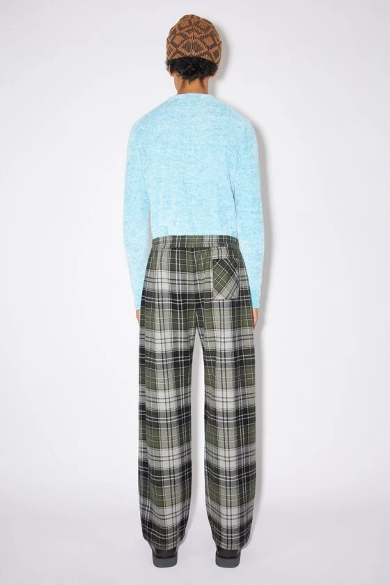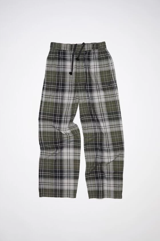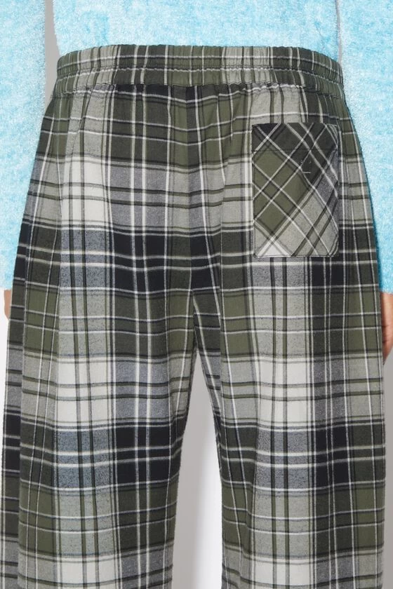 Acne Studios grey/dark green trousers feature a check pattern and are crafted from twill weave cotton with a peached flannel finish. Complete with a face logo patch on the front pocket and a face logo embroidery on the back pocket. Complete with an elasticated waistband, side seam pockets and a back patch pocket. Cut to a regular unisex fit with a mid rise and long length.
