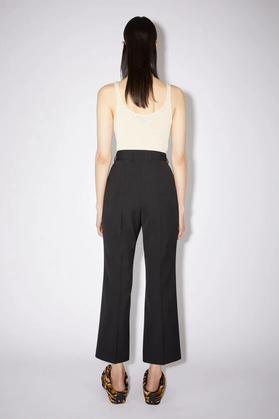 Acne Studios black wool-blend trousers are cut slim through the hips and fall into cropped, kick-flare legs with stitched pressed creases through the front.